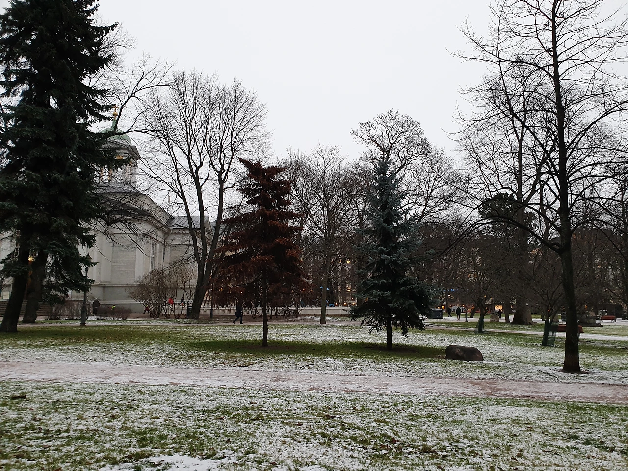 구글 지도를 보면서 캐리어를 끌고 우리가 예약한 라플랜드 호텔(Lapland Hotel)을 향해 걸었다. 헬싱키 중앙역에서 10분 정도 걸리는 거리였지만 초행길에 짐도 많아서 그보다 훨씬 더 걸렸던 것 같다. 가는 길 헬싱키 구성당 공원을 지나는데 잔디밭 위에 밀가루를 뿌려 놓은 것처럼 하얀 눈이 흩어져 있었다. 그래도 눈을 보긴 보는구나!