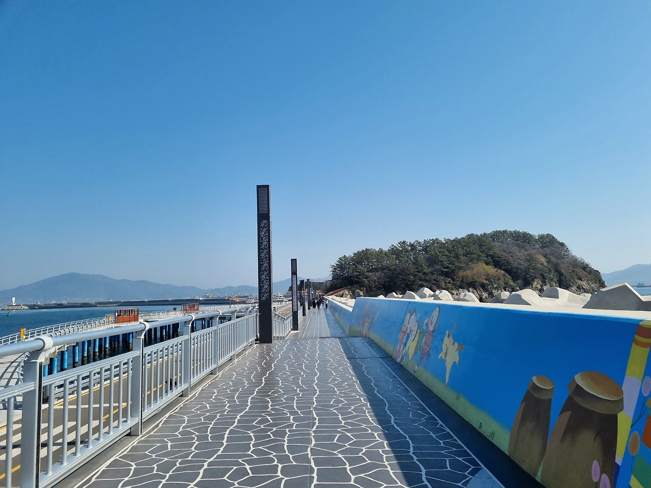 20여분간 방파제를 걸어서 오동도에 가도 되고 방파제 입구에서 오동도행 유람선을 탈 수도 있다. 우리는 가는 길에 바다도 구경하고 운동 삼아 걸을 겸 유람선을 타지 않았다. 멀리 방파제 끝으로 보이는 섬이 오동도였다. 처음에는 오동도가 눈 앞에 보여서 금방 갈 것 같았는데 생각보다 방파제가 길었다.