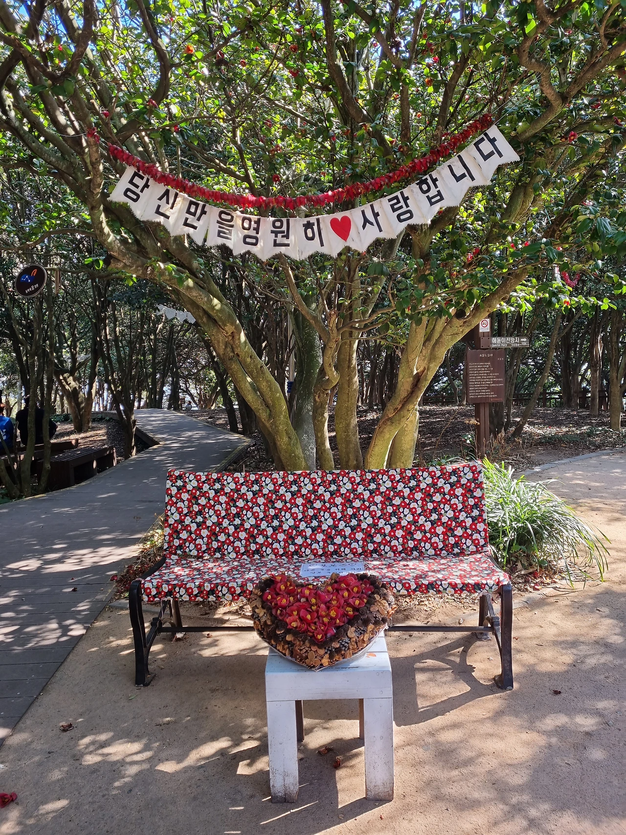 오동도. 멀리서 섬을 바라보면 그 모양이 오동잎처럼 생겨서 그리 불렸다고 한다. 하지만 오동도가 유명한 이유는 따로 있다. 바로 수천그루의 동백나무. 섬을 가득히 채운 동백나무들이 매년 1월에서부터 3월까지 섬을 붉은 꽃바다로 만든다. 나무 데크길을 따라 걸으며 멀리 파란 바다를 보고 붉은 동백꽃도 보았다. 빽빽히 들어선 나뭇잎들 사이사이로 햇살이 스며들었다. 만개해 바닥에 툭툭 떨어진 동백꽃들이 낙엽 깔린 바닥에 흩어져 있었다. 앞서 간 누군가는 떨어진 동백꽃들을 모아서 하트를 만들어 두었다.