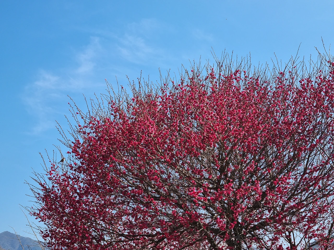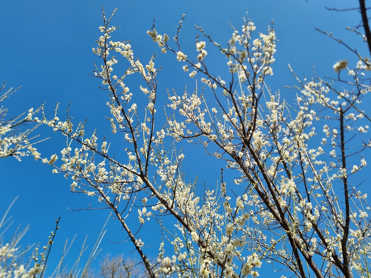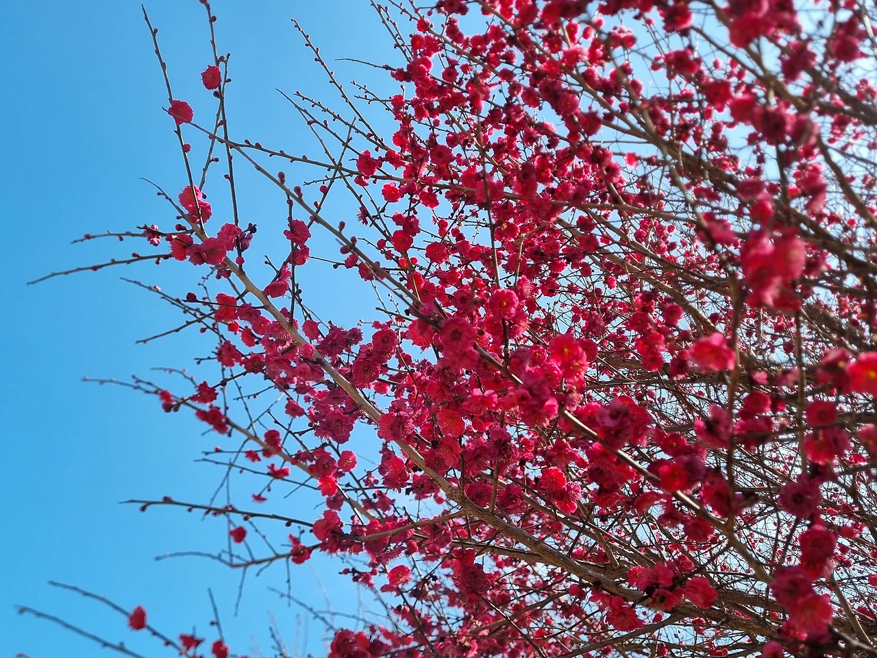 홍매는 하얀 매화들보다 더 많이 피어 있어 풍성해 보였다. 삐죽삐죽 하늘로 솟아오른 잔가지들에는 붉은 꽃들이 방울방울 달려 있었다. 진한 분홍색과 새파란 하늘의 대비가 보기 좋았다. 하늘이 푸르딩딩한 날이라 그런지 선명한 빛깔의 홍매가 더 예쁘게 느껴졌다.