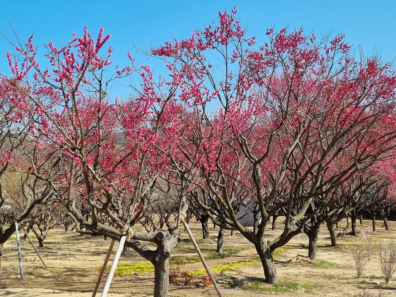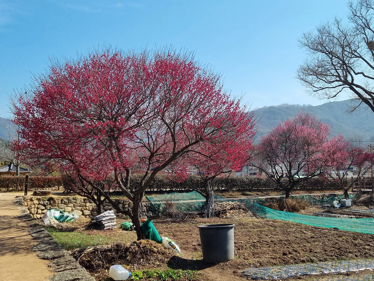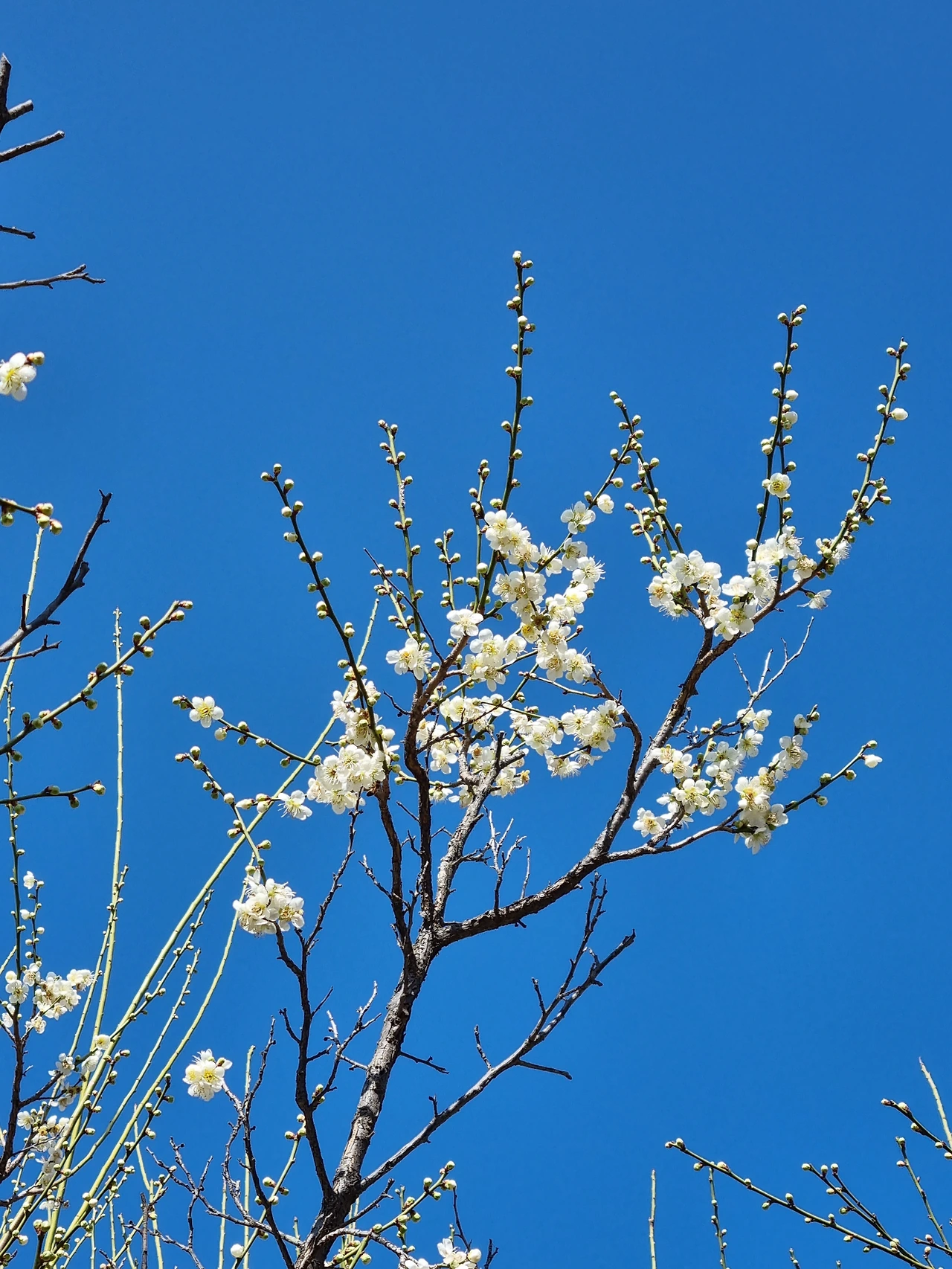 홍매는 하얀 매화들보다 더 많이 피어 있어 풍성해 보였다. 삐죽삐죽 하늘로 솟아오른 잔가지들에는 붉은 꽃들이 방울방울 달려 있었다. 진한 분홍색과 새파란 하늘의 대비가 보기 좋았다. 하늘이 푸르딩딩한 날이라 그런지 선명한 빛깔의 홍매가 더 예쁘게 느껴졌다.