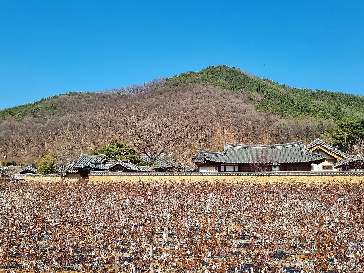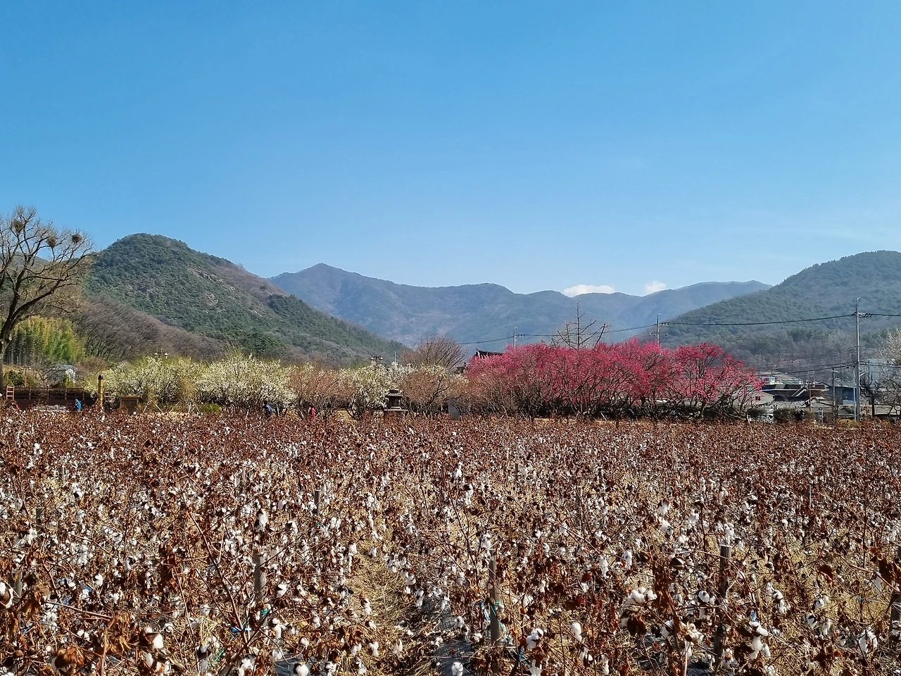 매화 나무들 옆으로는 넓은 목화밭이 펼쳐져 있었다. 이곳에 왜 목화밭이 있는가 싶었는데 문익점 동상을 보고 이유를 알았다. 이곳에 살고 있는 남평문씨 일족이 우리나라에 목화씨를 들여온 문익점의 후손이라고 한다. 꽃집에서 장식용으로 파는 목화를 본 적은 있어도 이렇게 노지에 가득 솜들이 피어있는 모습은 처음이었다. 하얀 솜을 만져보니 아주 부드럽고 몽글몽글했다. 일상에서 자주 접하는 솜은 이런 모양이 아니라서 이 목화가 솜이 된다는 것이 눈으로 보면서도 믿기지가 않았다.