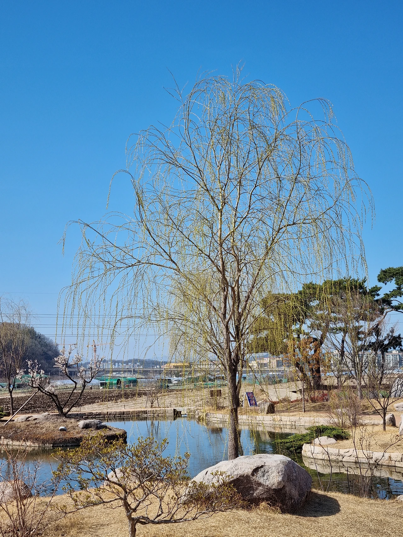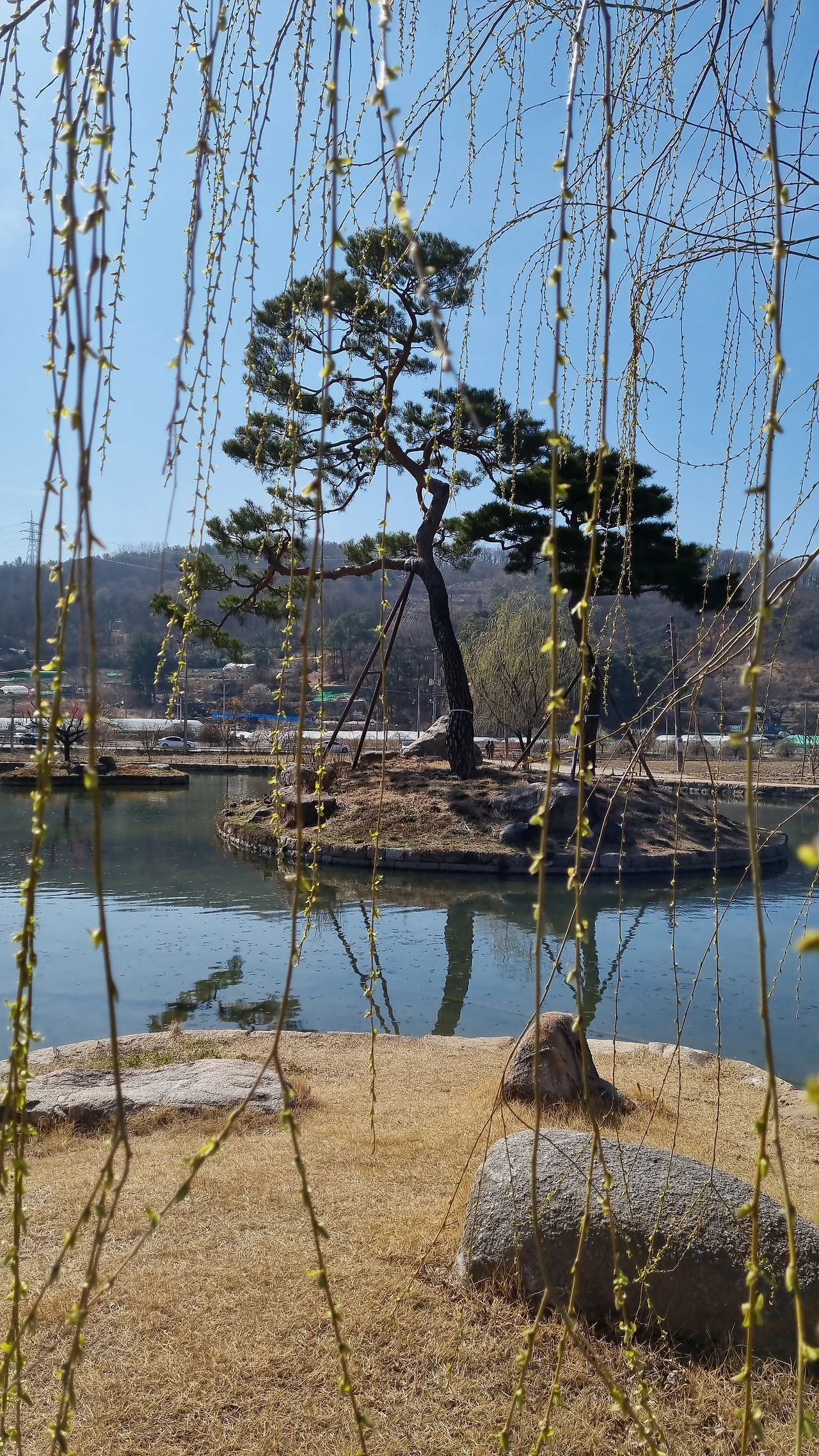 연못 근처에 있는 버드나무 가지에서는 귀여운 아기 새싹들이 돋아나고 있었다. 새싹들은 아직 덜 여문 초록빛이었다. 축 늘어진 가지들이 바람 따라 흔들흔들 춤을 췄다. 아름다운 풍경이었다.