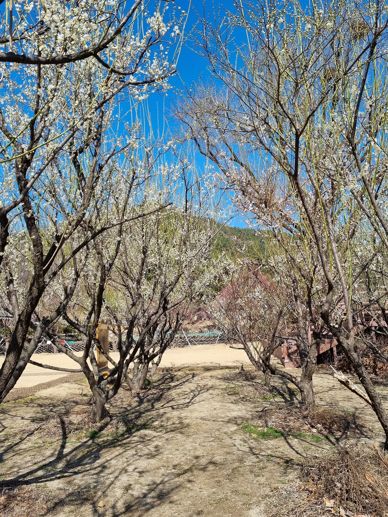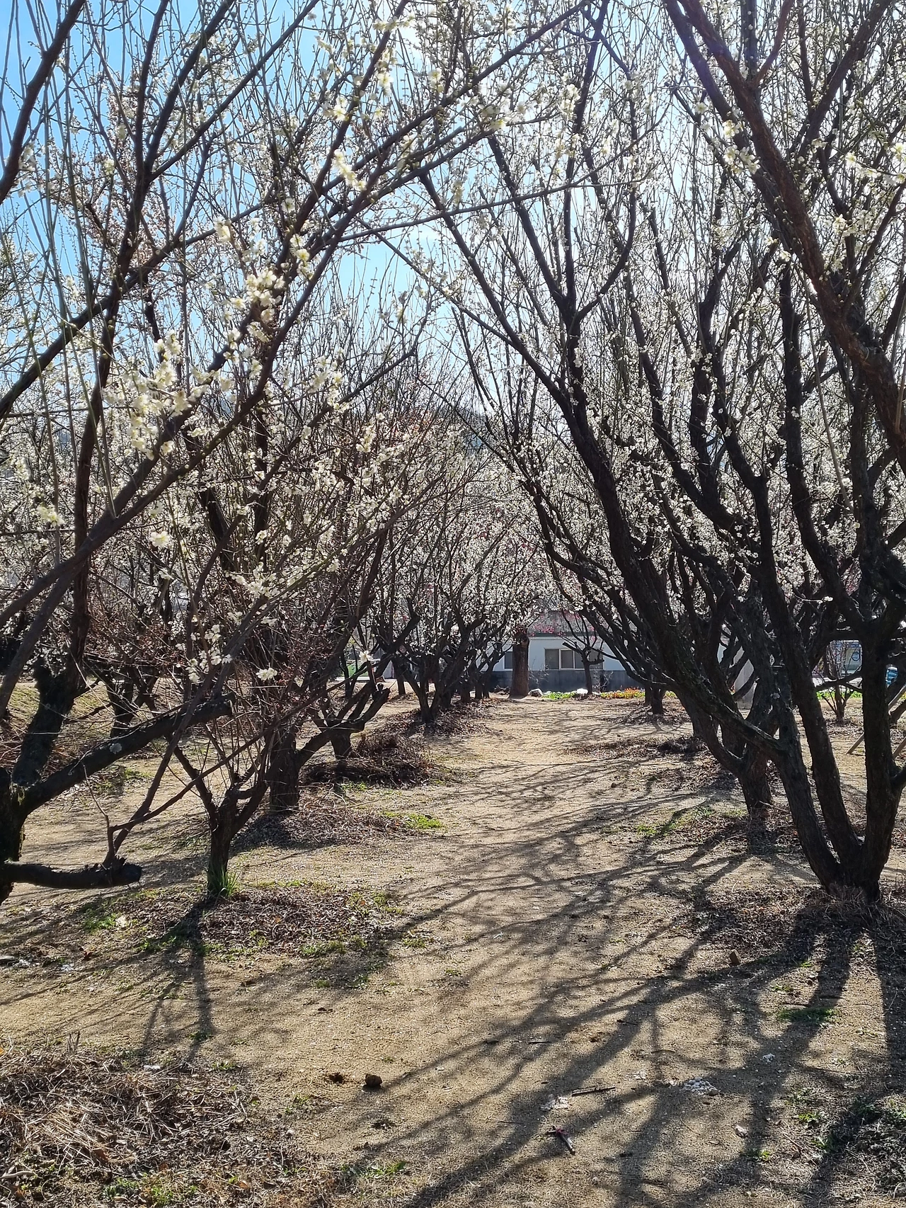 약간 푸른 빛깔이 도는 하얀 매화가 파란 하늘에 팝콘처럼 피었다. 아직 매화는 만개하기 전이었다. 하얀 눈송이 같은 봉오리들이 가지마다 맺혀 있었다. 여기 서있는 매화나무들는 키가 커서 하늘을 올려다 보아야 꽃들이 많이 보였다. 잉잉잉- 귓가에 벌들이 돌아다니는 소리가 요란했다.