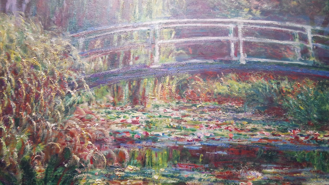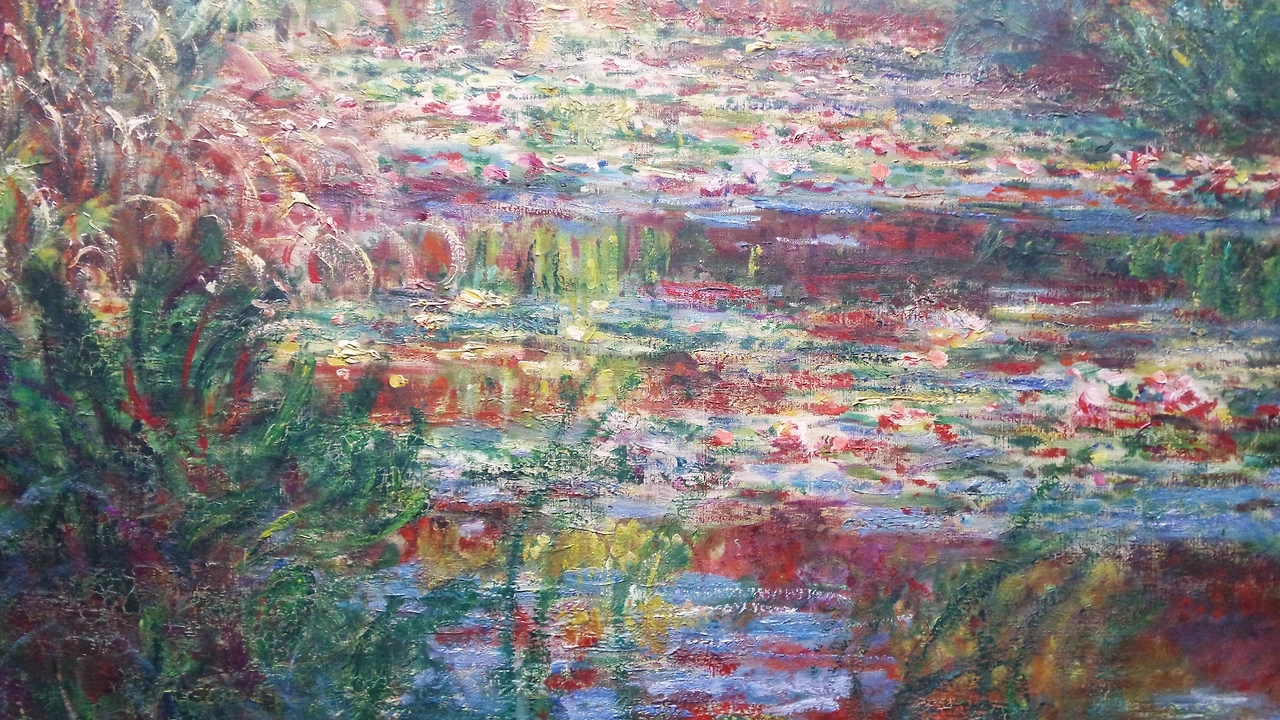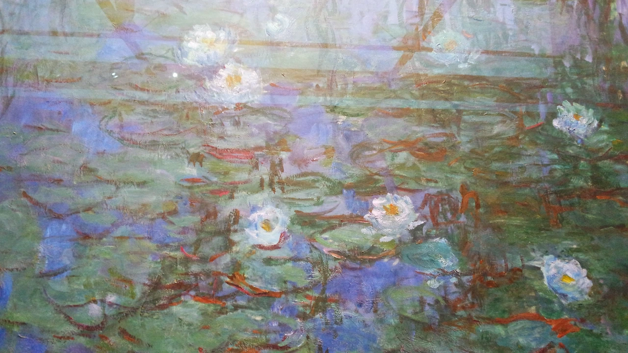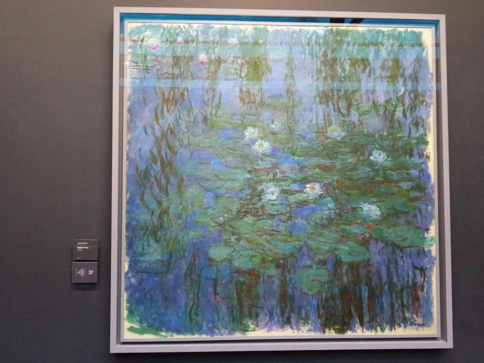 푸른 수련은 아마도 새벽 무렵 태양이 떠오르기 전 하늘이 검푸르스름할 때 모습을 그린 것 같았다. 가까이서 보면 꾸덕한 물감의 질감이 그대로 느껴졌고 거칠며 투박해 보였다. 하지만 조금만 뒤로 물러서서 보면 모든 빛깔들이 부드럽게 서로 이어져 몽환적인 정원의 모습이 나타났다.