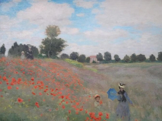 푸른 하늘에 구름들이 흩뿌려져 있고 언덕 위 작은 집이 하나 보인다. 양산을 든 여인과 어린 아이가 붉은 양귀비 꽃밭을 걸어가고 있다. 그림 앞쪽 뿐 아니라 뒤쪽에도 조그맣게 여인과 아이의 모습이 보인다. 그림 속 인물들은 모네의 부인 카미유와 아들 장이다. 그림에서 가족에 대한 따뜻한 사랑이 느껴졌다.