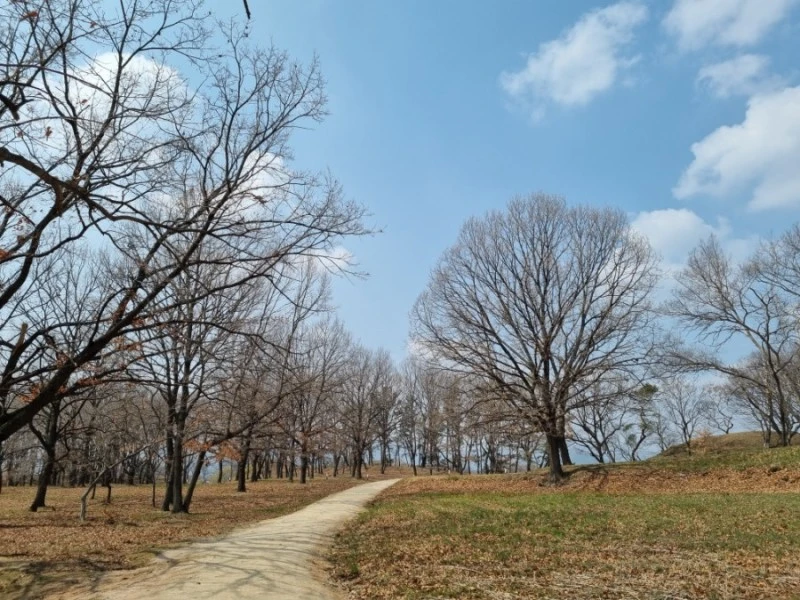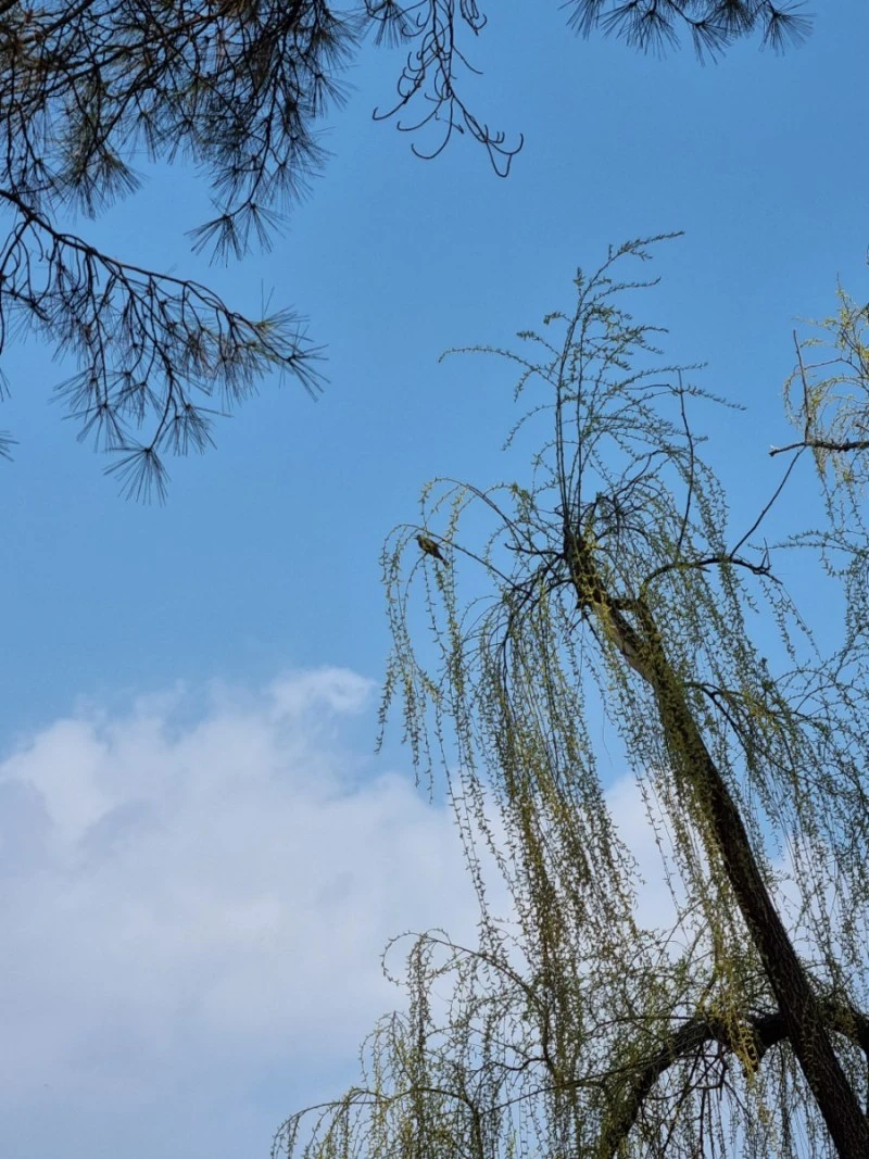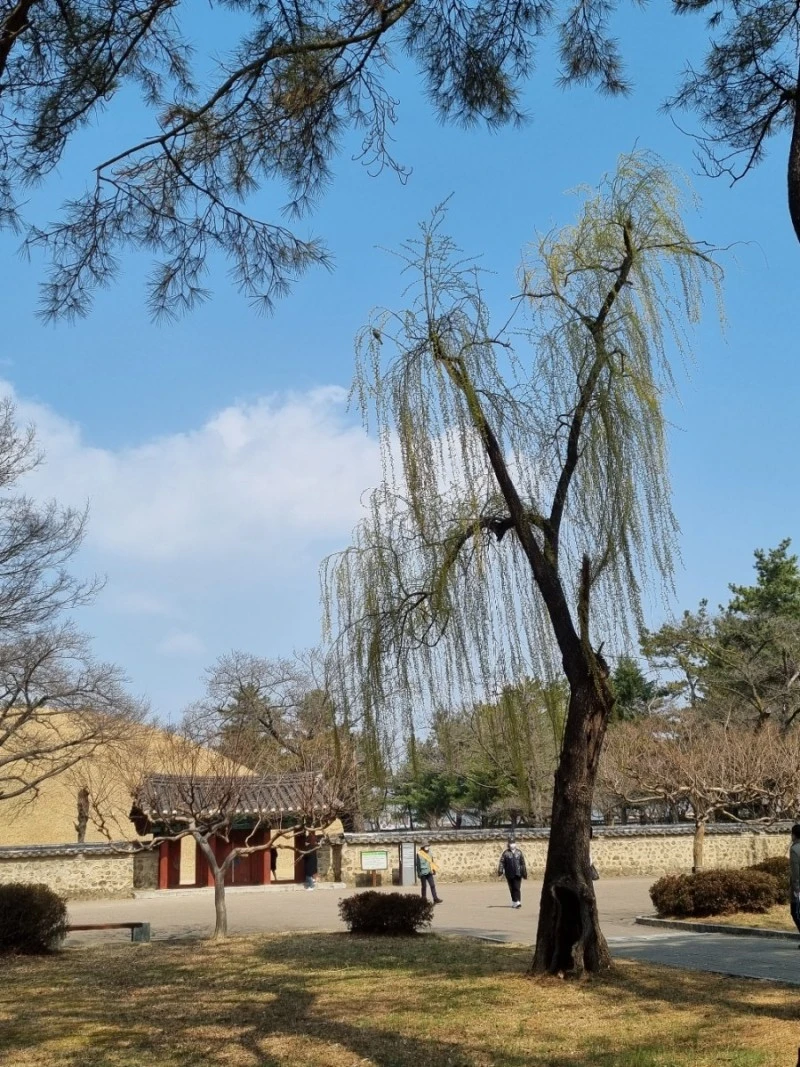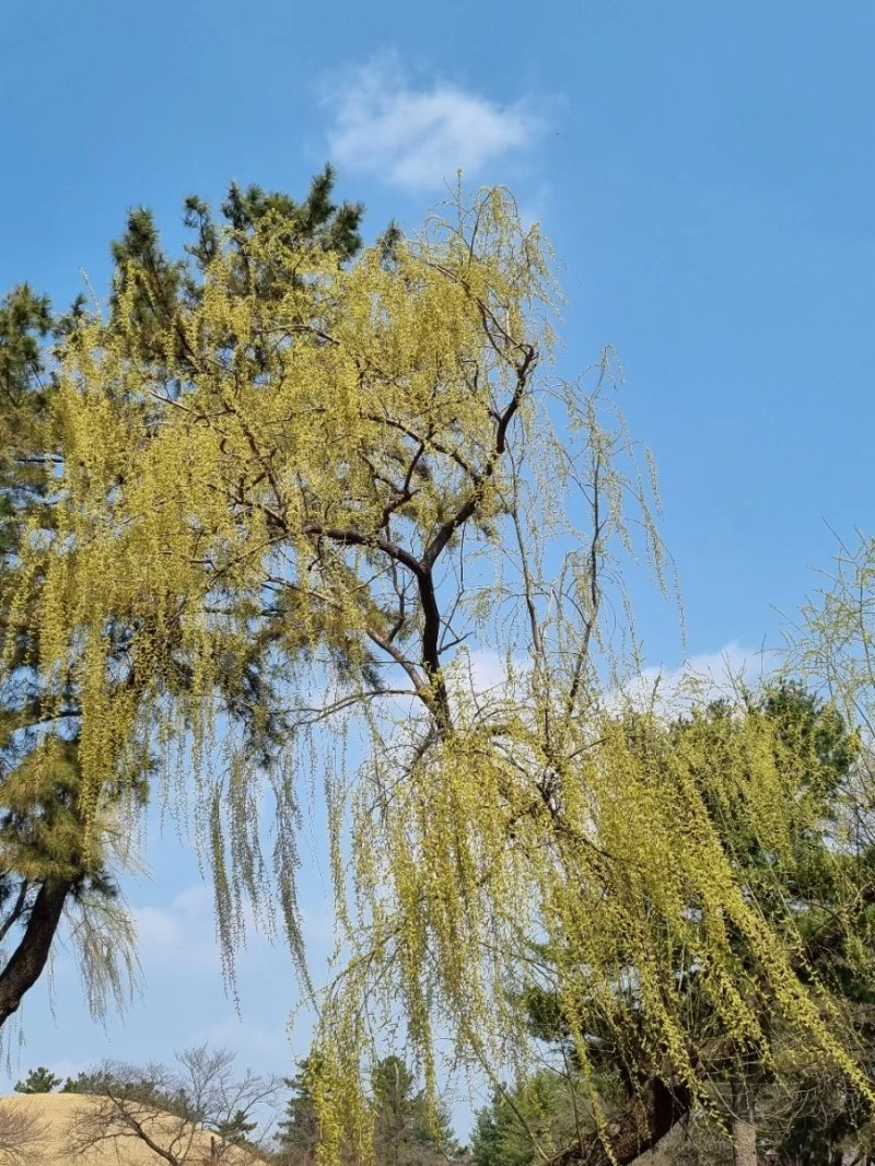 미추왕릉 근처에서 여린 잎사귀가 파릇파릇 돋아난 능수버들을 만났다. 늘어진 가지가 바람에 하늘하늘 흔들리는 모습은 춤을 추는 것 같았다. 버들나무 가지 위에는 조그만 새가 한 마리가 앉아서 쉬고 있었다. 하늘은 파랗고 구름은 하얗고 막 돋아난 새싹들, 아름다운 봄 풍경이었다.