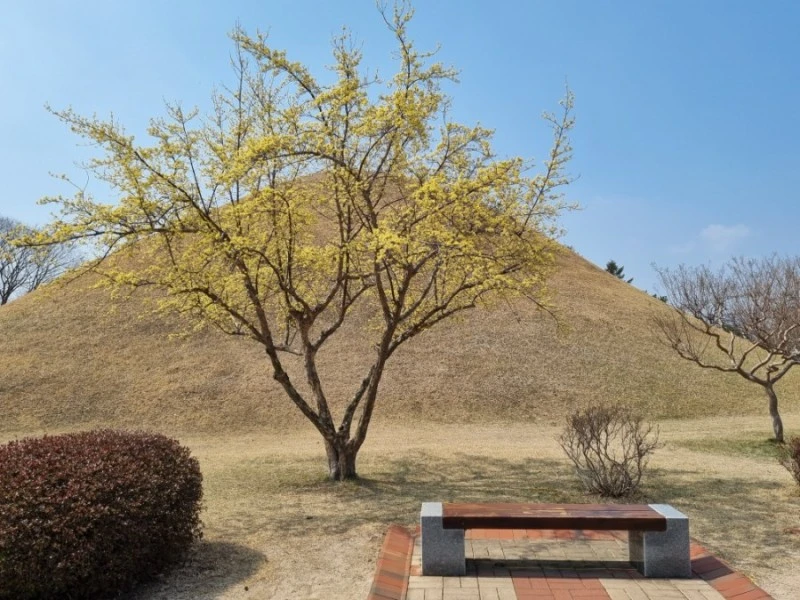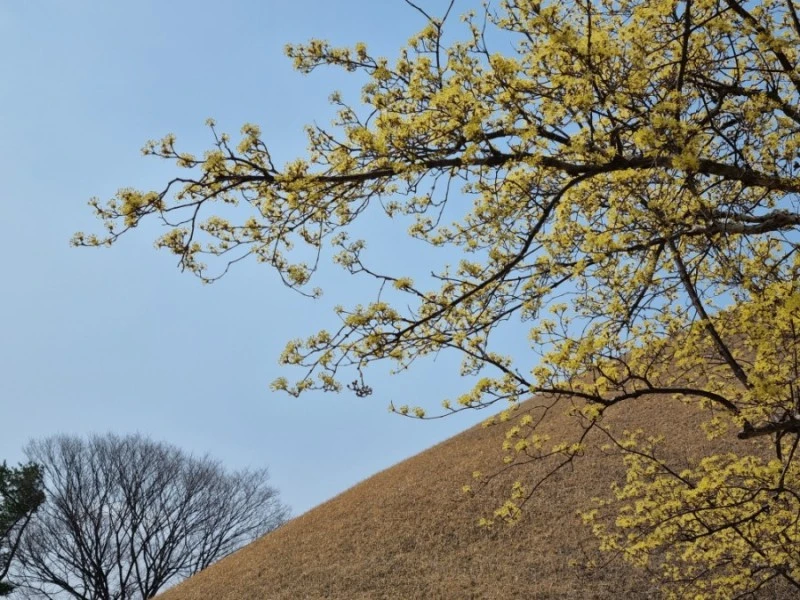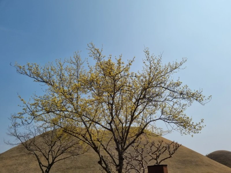 안쪽으로 걸어 들어가니 능 주변이 노랗게 산수유 꽃으로 물들어 있었다. 대릉원 안에 산수유 나무들이 이렇게 많은 줄 몰랐었다. 여름에 왔을 때는 초록 나뭇잎들이 무성했고 겨울에 왔을 때는 빈 가지였으니 산수유 나무인 줄 몰랐었다.