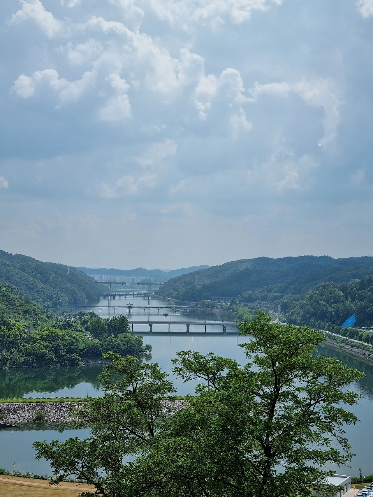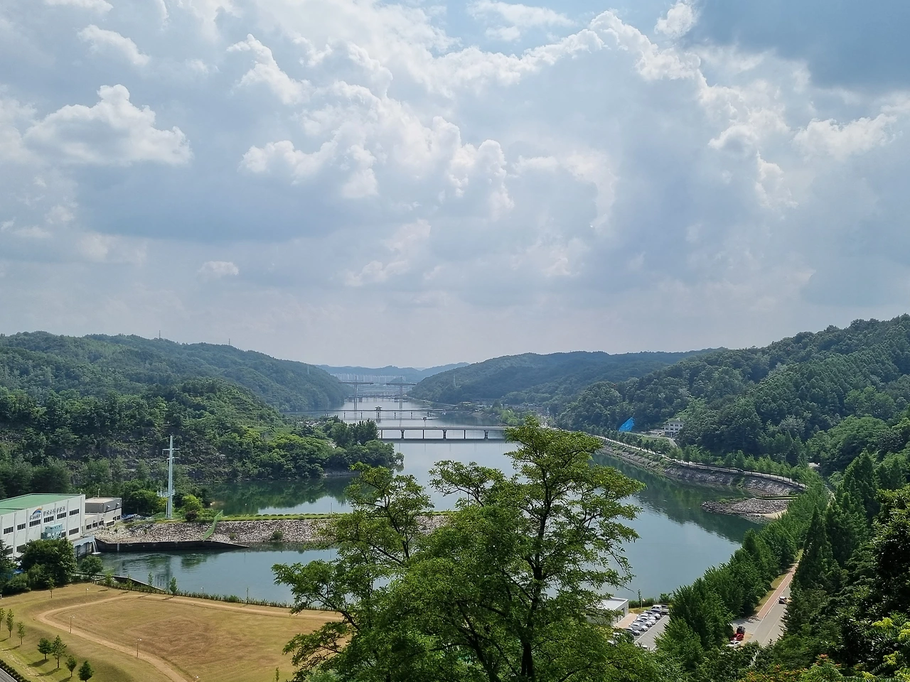 하늘에는 구름이 두둥실 떠 있었고 그 아래로는 강물이 잔잔히 고여 있었다. 고여 있는 물 위로 푸르른 나무들의 반영이 떠 있었다. 멀리 산 아래로는 아파트들이 보였다. 아름다운 풍경이었다. 왠지 저 나무들 가득한 곳에 공원이 있을 것 같았다. 아마도 댐에 고여 있는 물길을 따라서 공원이 만들어져서 '낙강물길공원'인가 보다.