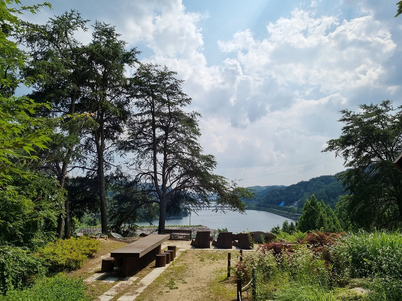 네비게이션에 '폭포공원'을 찍고 곧장 주차해서 정원을 둘러볼 수 있는데 우리는 '안동루' 근처에 주차를 하고 공원 쪽으로 내려가기로 했다. 정자에 올라서니 안동댐이 시원하게 내려다 보였다.