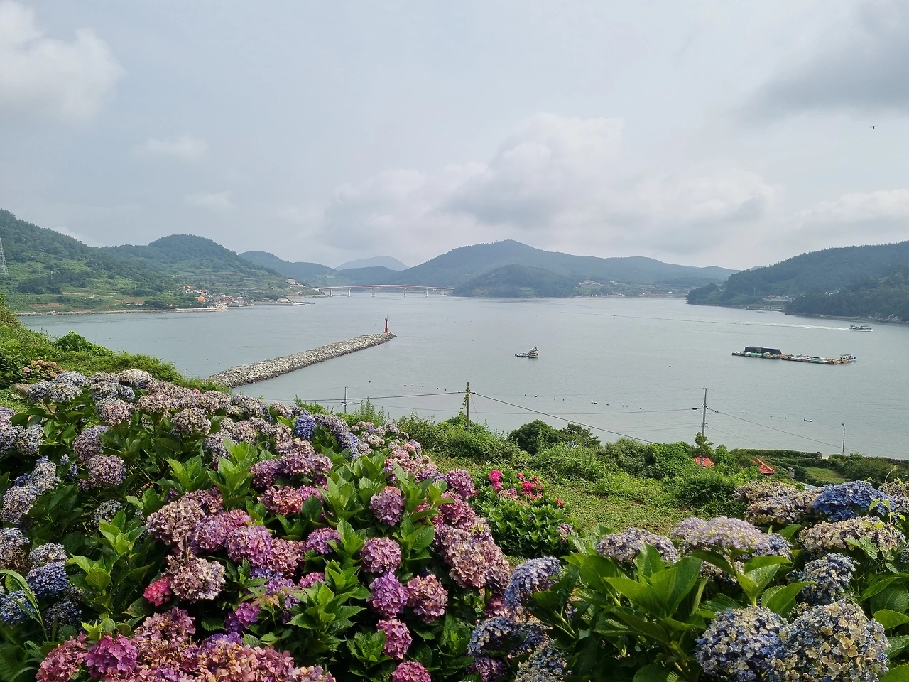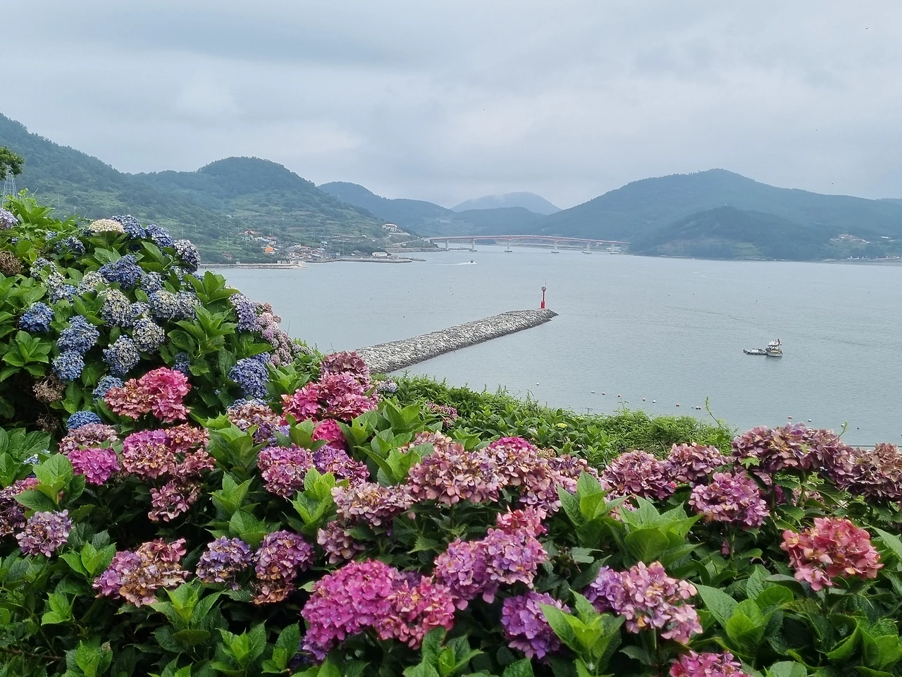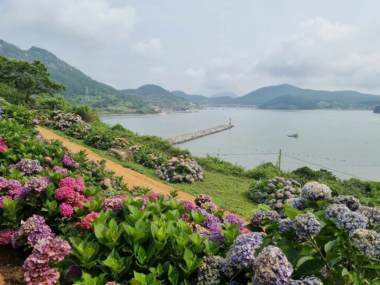 수국 정원에서 가장 아름다웠던 풍경은 수도 없이 핀 수국 꽃들과 함께 내려다 보이던 바다였다. 멀리 수평선 부근에는 섬들이 줄줄이 이어진 모습들이 보였다. 그리고 눈이 부시게 파란 하늘과 바다 그리고 홀로 우뚝 서있던 빨간 등대가 보였다. 오른편으로는 우리가 배를 탄 나로도항과 배에서 내린 선착장, 그리고 주민들이 살고 있는 작은 마을이 내려다 보였다. 이 멋진 풍경을 보러 여기 먼 고흥 땅 쑥섬까지 왔구나 싶었다. 너무 아름다워서 사진 찍는 걸 멈추기가 어려웠다. 카메라에 담고 또 담고 아무리 담아도 내 눈으로 직접 보는 것에 비할 바 못되었지만 계속해서 사진을 찍었다.