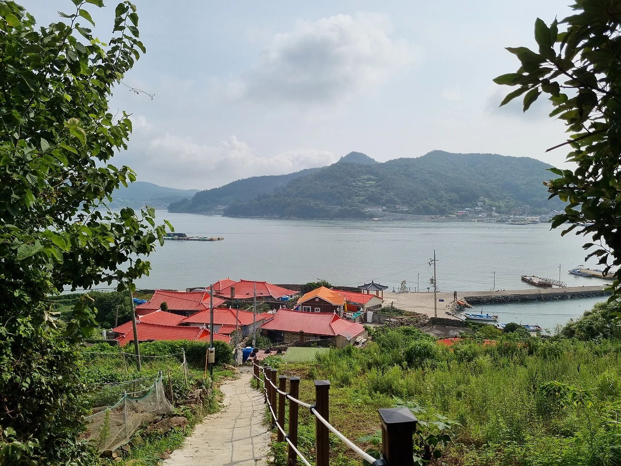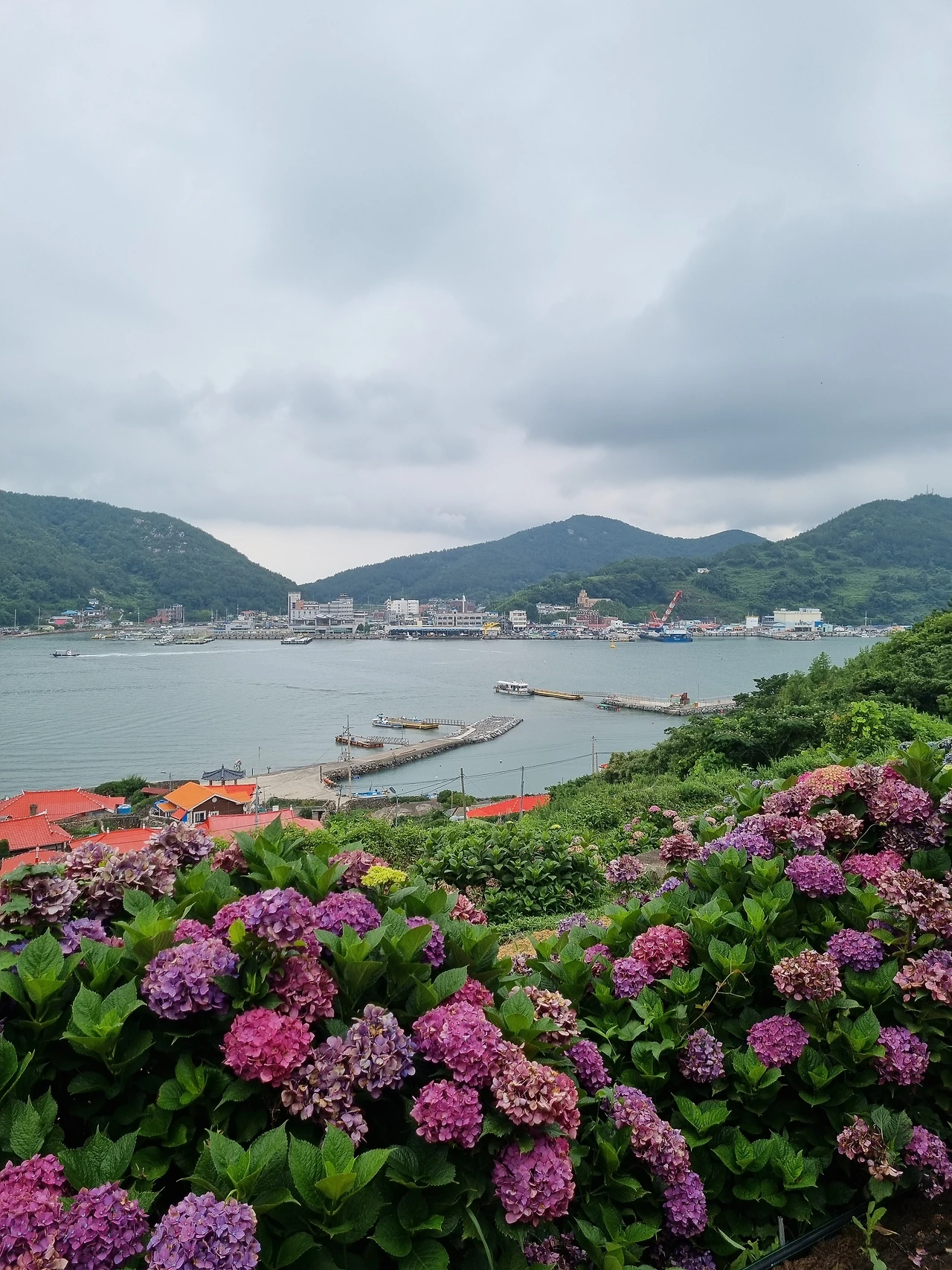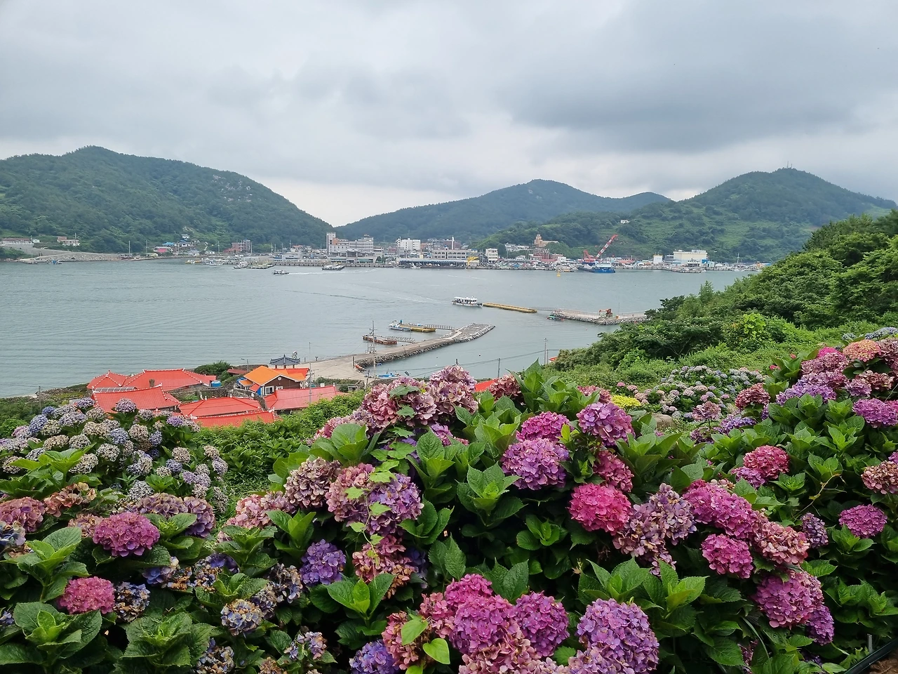수국 정원에서 가장 아름다웠던 풍경은 수도 없이 핀 수국 꽃들과 함께 내려다 보이던 바다였다. 멀리 수평선 부근에는 섬들이 줄줄이 이어진 모습들이 보였다. 그리고 눈이 부시게 파란 하늘과 바다 그리고 홀로 우뚝 서있던 빨간 등대가 보였다. 오른편으로는 우리가 배를 탄 나로도항과 배에서 내린 선착장, 그리고 주민들이 살고 있는 작은 마을이 내려다 보였다. 이 멋진 풍경을 보러 여기 먼 고흥 땅 쑥섬까지 왔구나 싶었다. 너무 아름다워서 사진 찍는 걸 멈추기가 어려웠다. 카메라에 담고 또 담고 아무리 담아도 내 눈으로 직접 보는 것에 비할 바 못되었지만 계속해서 사진을 찍었다.
