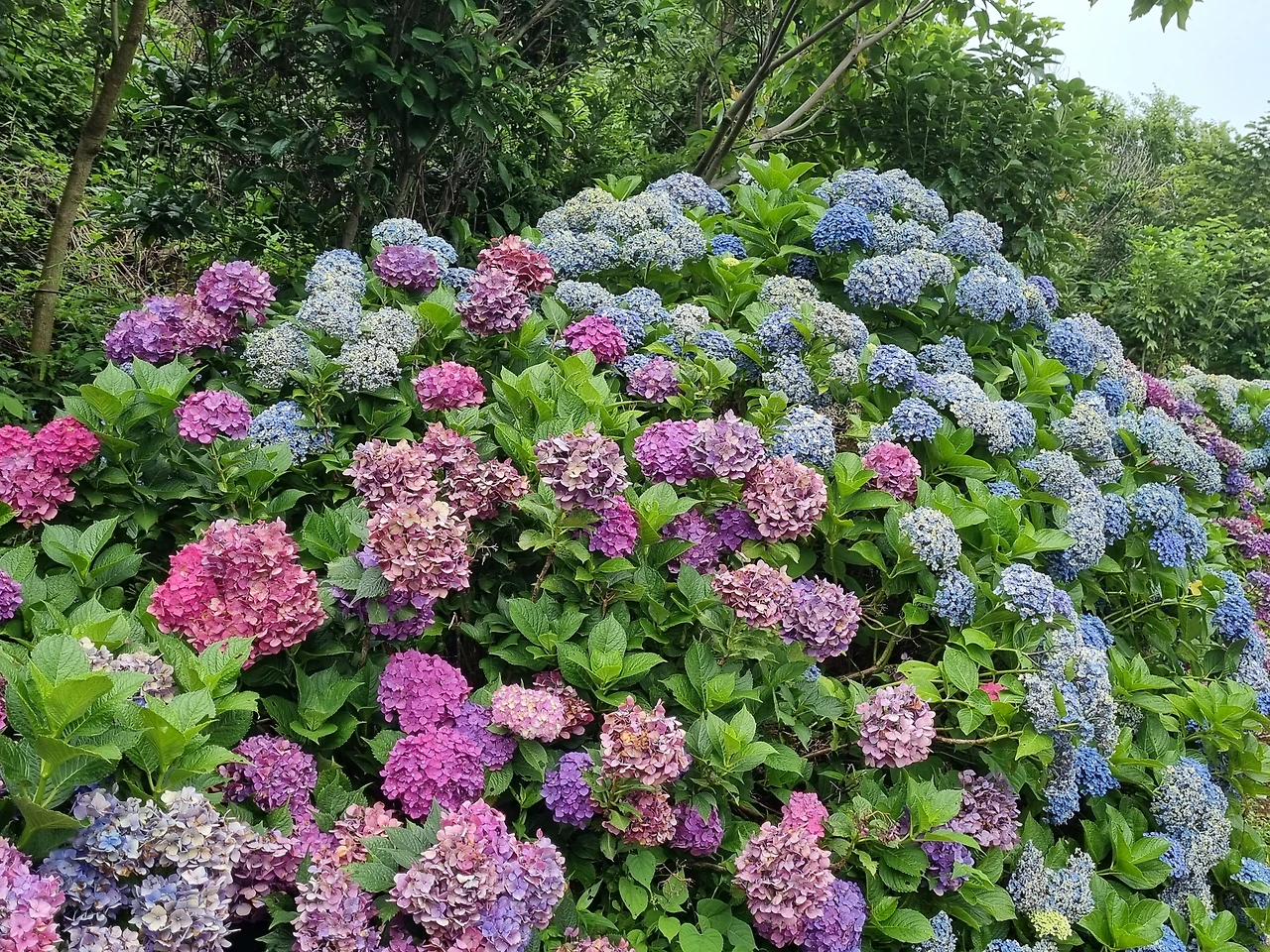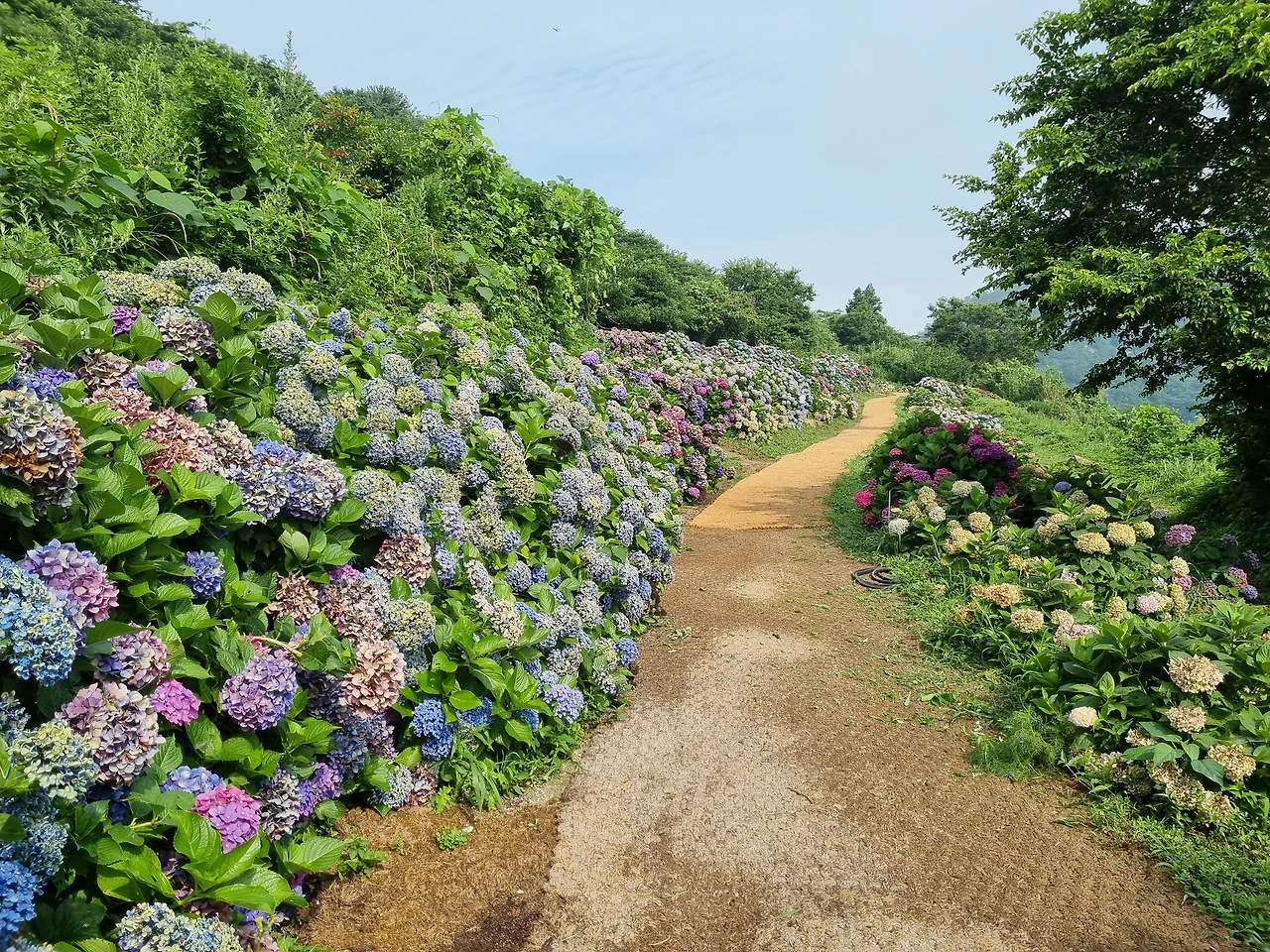 언덕길을 올라가는데 우와, 더위가 장난이 아니었다. 여름날 그늘 없는 햇볕 아래를 걷는다는 것은 정말 쉬운 일이 아니구나 싶었다. 혹시라도 비가 내릴까봐 우산을 가져 왔는데 비가 아닌 햇빛을 막는데 쓰였다. 여름날 쑥섬을 둘러보려면 시원한 생수 한 통과 양산은 필수였다. 조그만 언덕을 오르고 나면 이제 수국이 보이기 시작한다. 아름다운 형형색색 수국꽃들이 가득 피어 있었다.