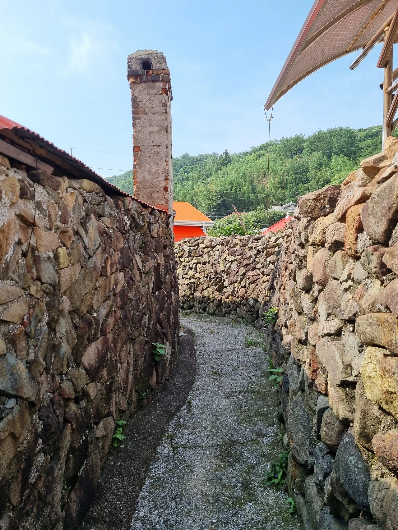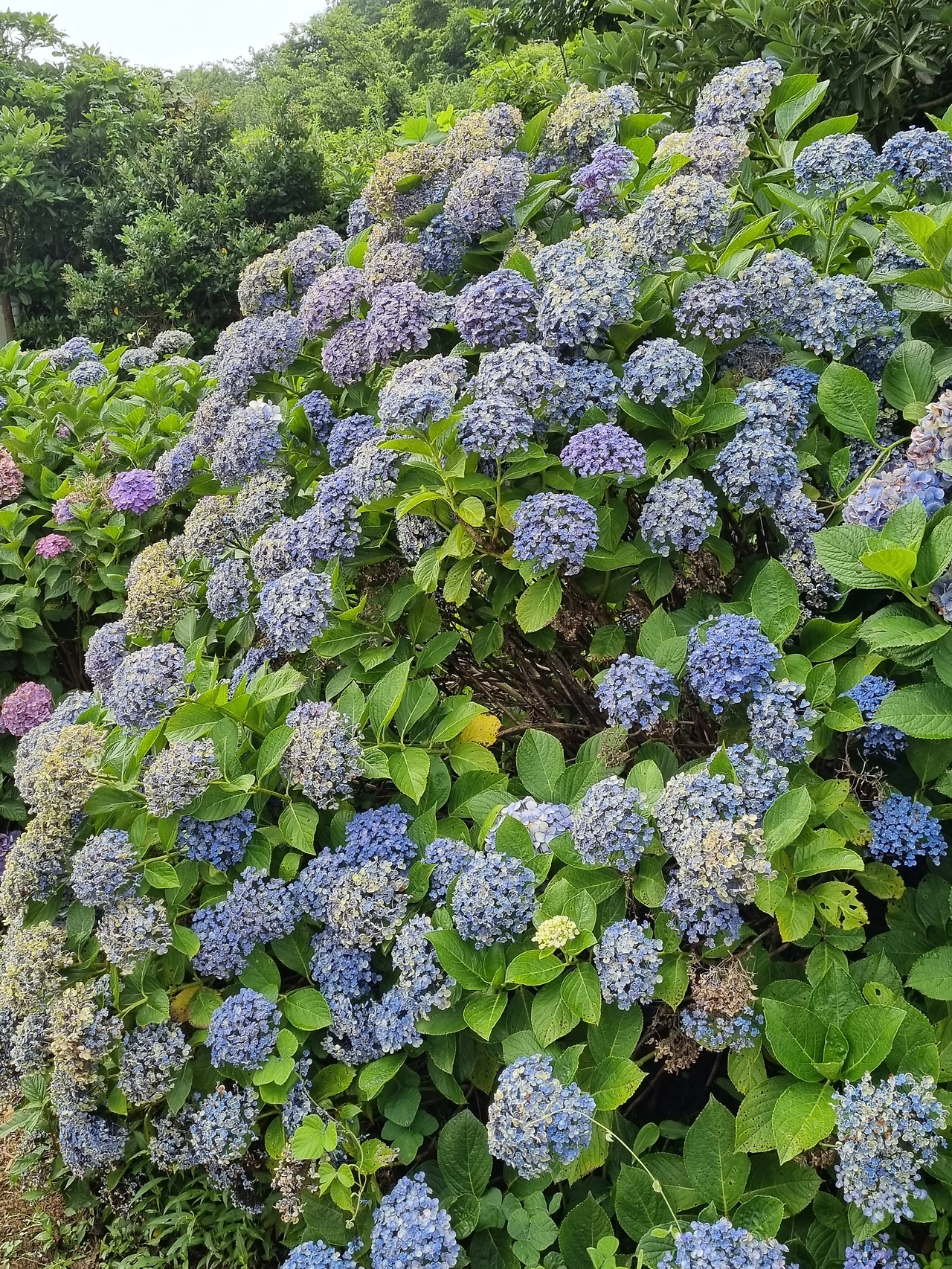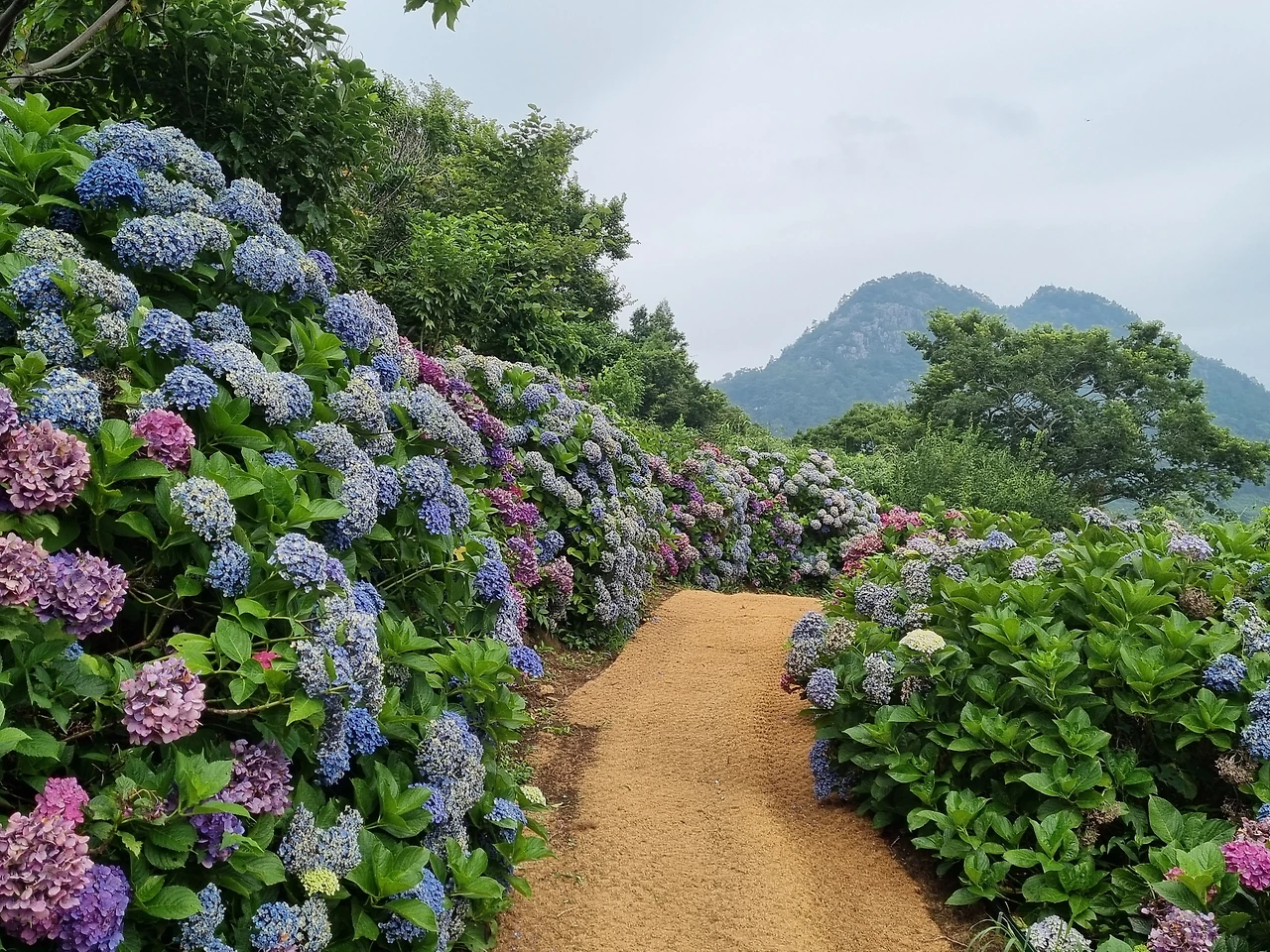원래 트래킹 코스는 난대림을 지나서 섬을 한바퀴 도는 것인데 점심을 먹기 전 잠깐 시간이 남아서 수국이 가득 핀 정원에 먼저 올라갔다 오기로 했다. 쑥섬에 들어와서 오른 쪽으로 쭉 걸어 나가서 사랑의 돌담길을 지나 언덕 위로 올라가면 바로 수국들과 만날 수 있다.