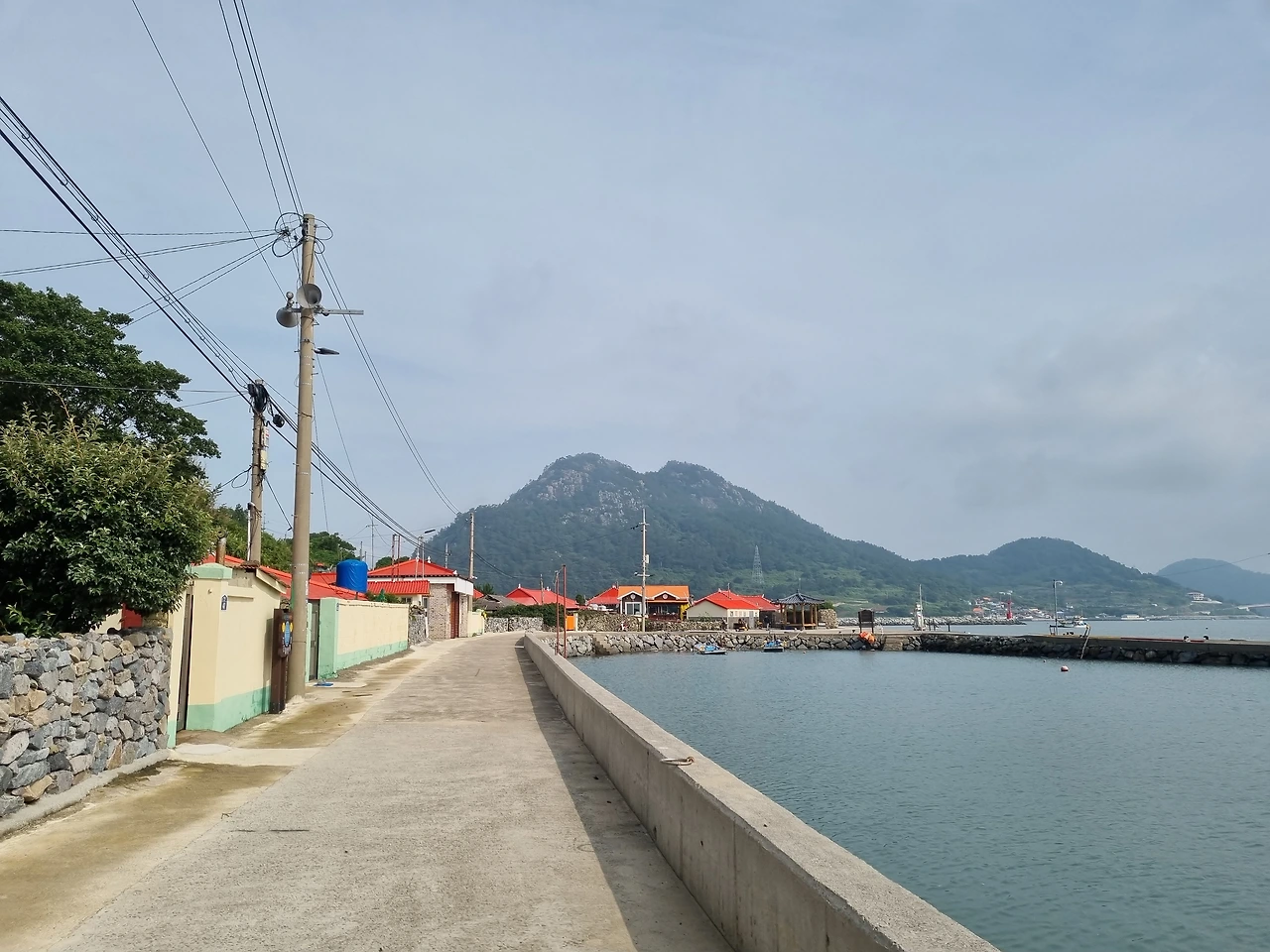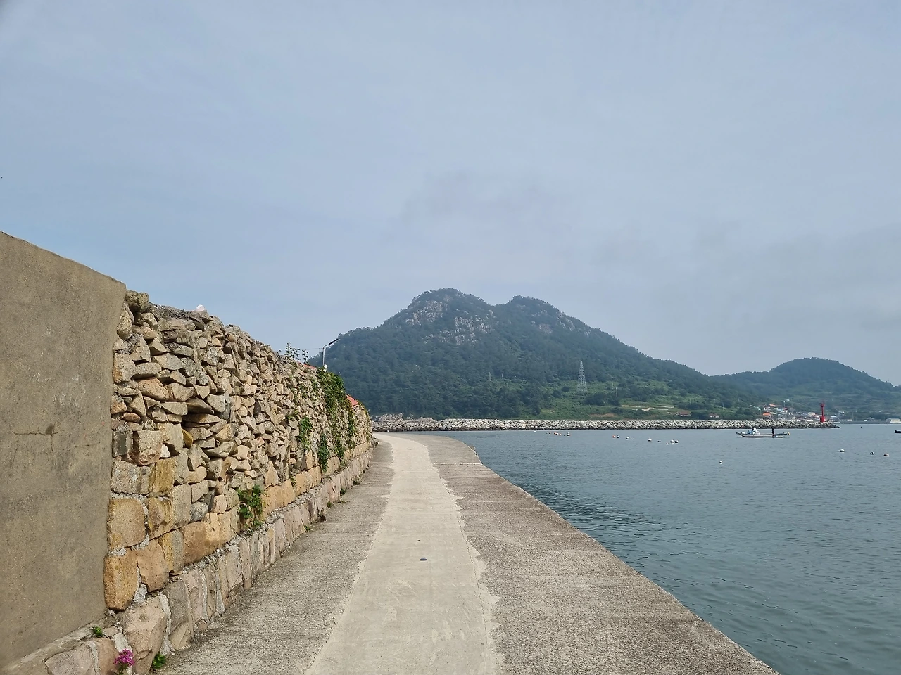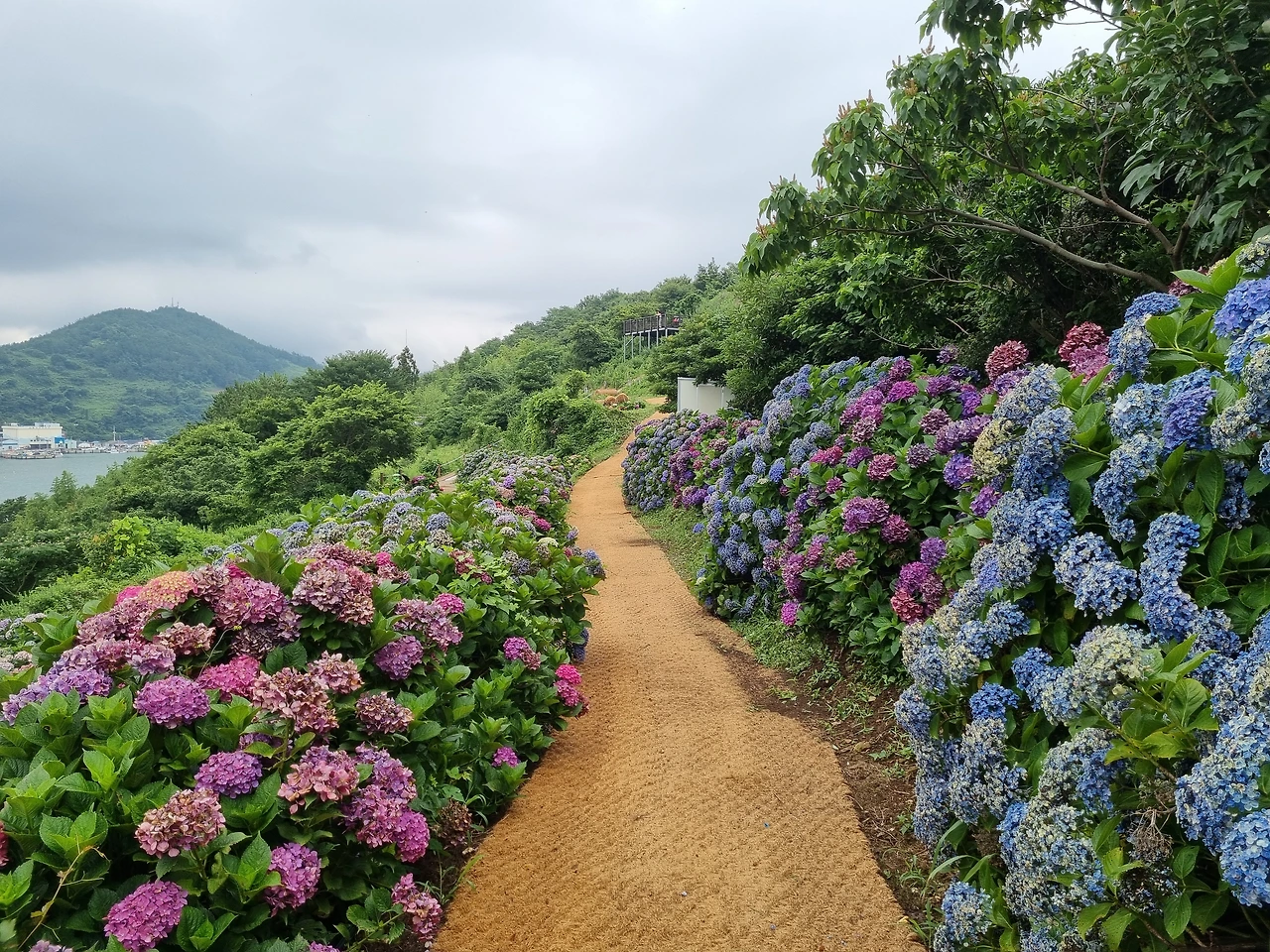 만개 시기가 지나서 시든 수국들도 있었지만 전체적으로 보면 아직까지는 흐드러지게 수국 꽃들이 많이 피어 있었다. 특히 송글송글 동그란 꽃잎 모양으로 피어난 팝콘 수국꽃은 한창 피고 있는 시기 같았다. 잘 닦인 길을 따라서 수국 꽃들이 가득한 담벼락이 쭉 이어져 있었다. 풍성하게 핀 수국들을 보며 길을 걸었다. 왼쪽으로는 수국 꽃들이 가득하고 오른쪽으로는 바다가 내려다 보이니 눈이 아주 즐거웠다.