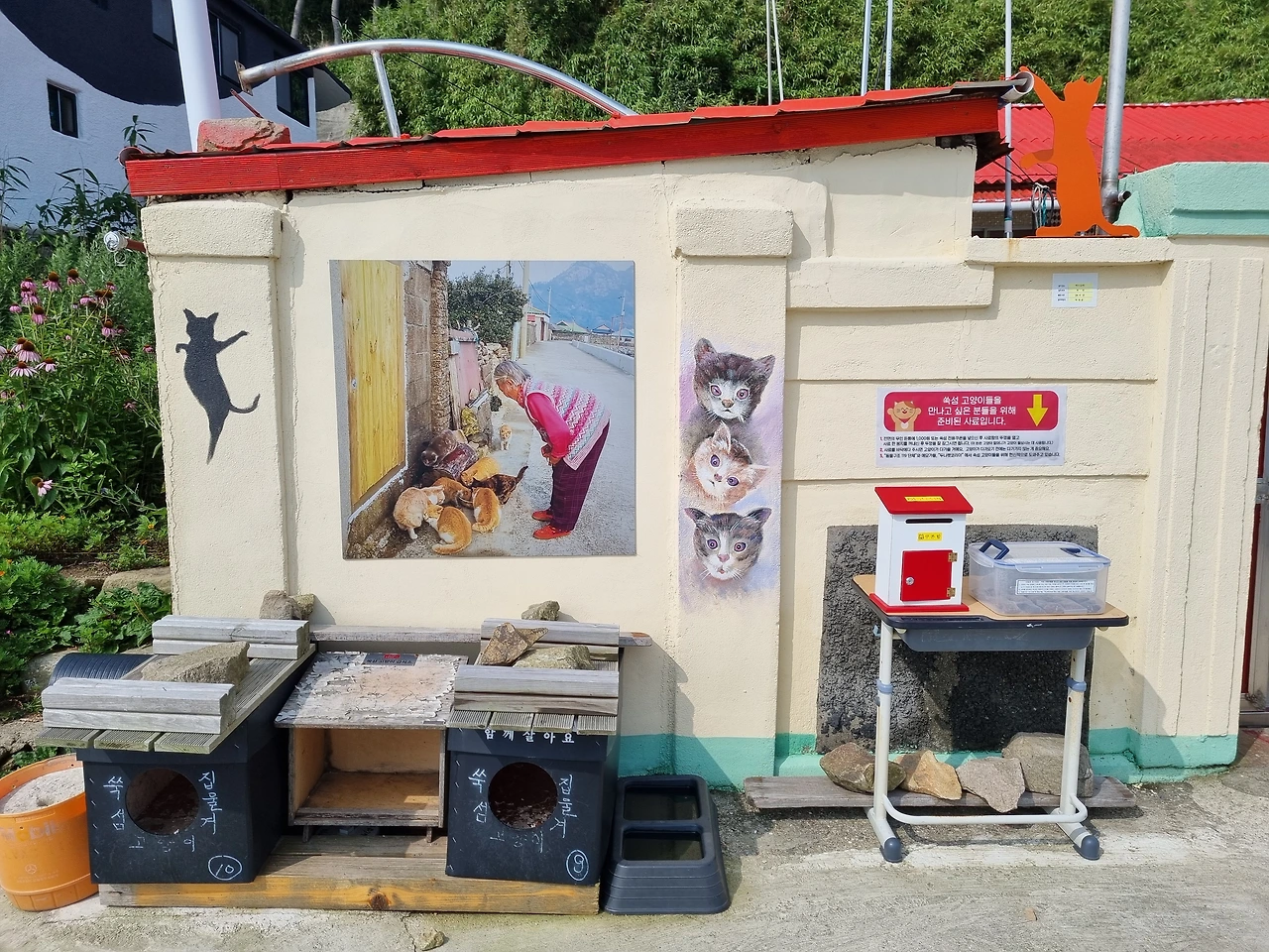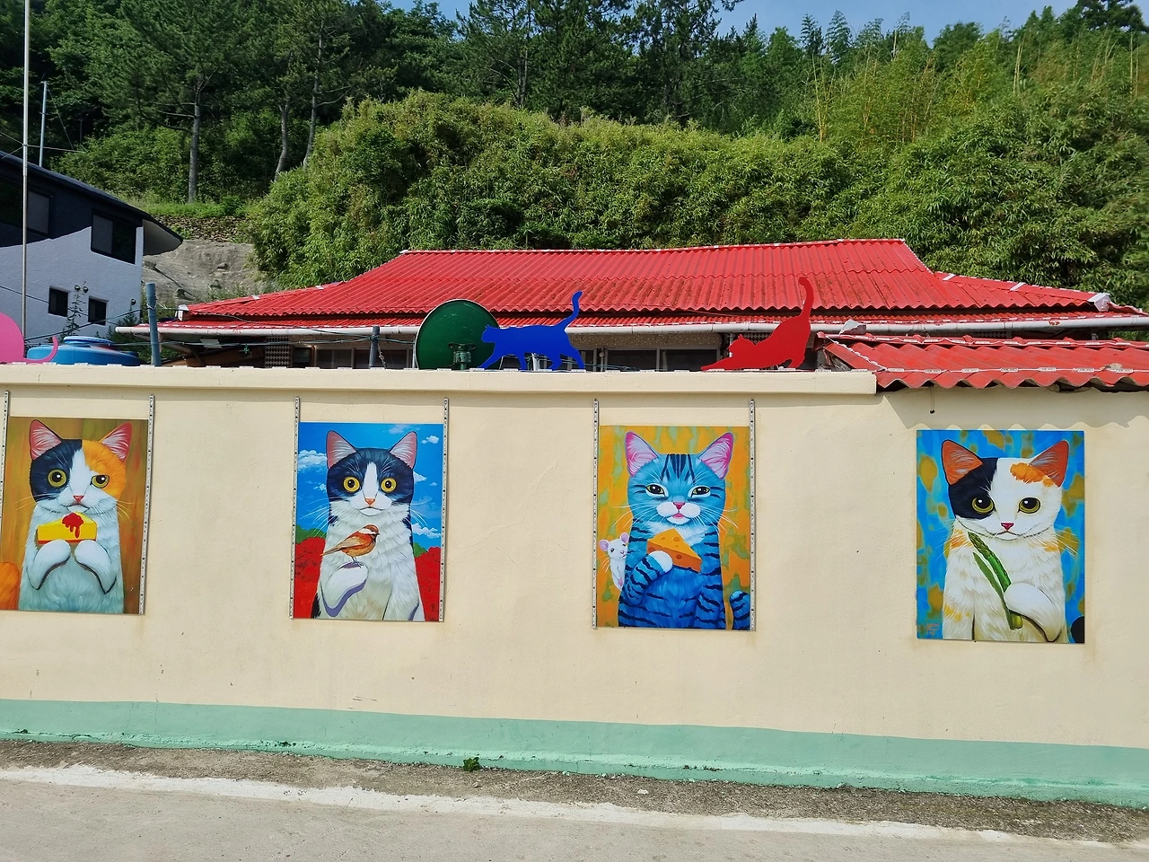 쑥섬에 들어서면 고양이와 관련된 것들이 많이 보인다. 괜히 고양이 섬이라고 불리는 것이 아니다. 왓냐옹- 하며 우릴 반겨주는 고양이 조형물, 아기자기한 고양이 벽화, 고양이 할머니 집 그리고 진짜 고양이들! 쑥섬으로 들어오는 표를 구입하면 팜플렛을 하나씩 주는데 팜플렛 아래에 1,000원 쿠폰이 하나씩 붙어 있다. 이 쿠폰을 가지고 할머니 집 앞에서 고양이 간식을 하나 사서 고양이에게 줄 수도 있다. 고양이를 좋아한다면 맛있는 간식을 챙겨오는 것도 좋을 것 같다. 본래 쑥섬에 고양이가 많이 살고 있었는데 동물 보호 단체와 연이 닿으면서, 주민들과 보호 단체가 함께 고양이를 돌보고 있다고 한다. 길을 걸어 다니다 보면 귀여운 고양이들을 자주 볼 수 있다.