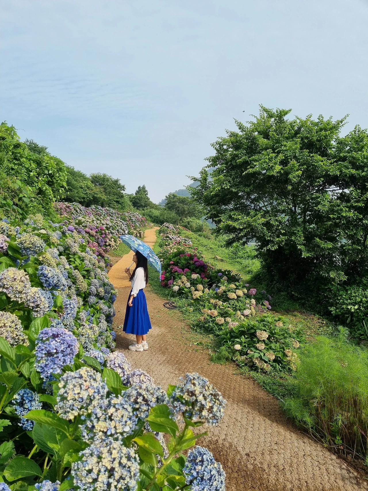 이른 아침이라 그런지 이 넓은 수국 정원에 우리 둘 뿐이었다. 쑥섬을 우리가 빌린 듯한 기분이 들었다. 수국 정원 곳곳을 거닐며 사진들을 참 많이도 찍었다. 그늘이 없어 들고온 우산으로 햇빛을 가려가며 걸어 다녔다. 파란 우산을 들고 왔는데 탐스러운 파란 수국들과 함께 사진에 담으니 보기 좋았다.