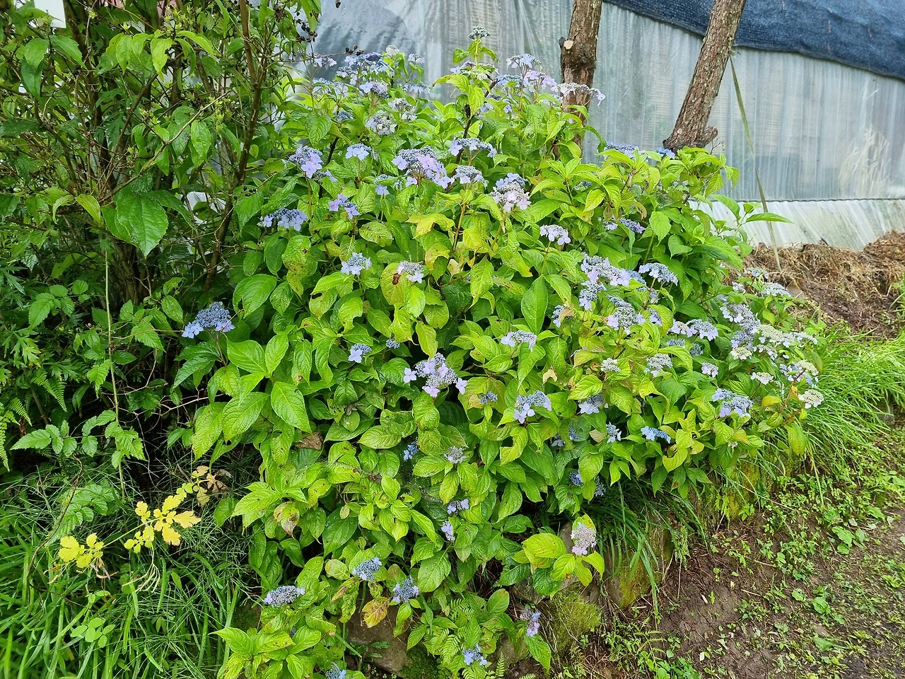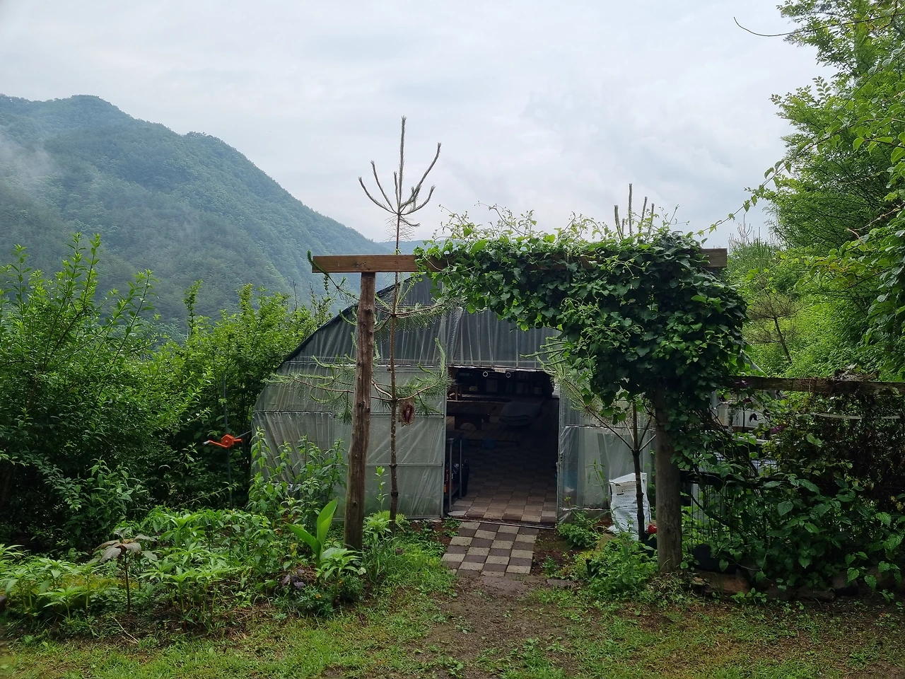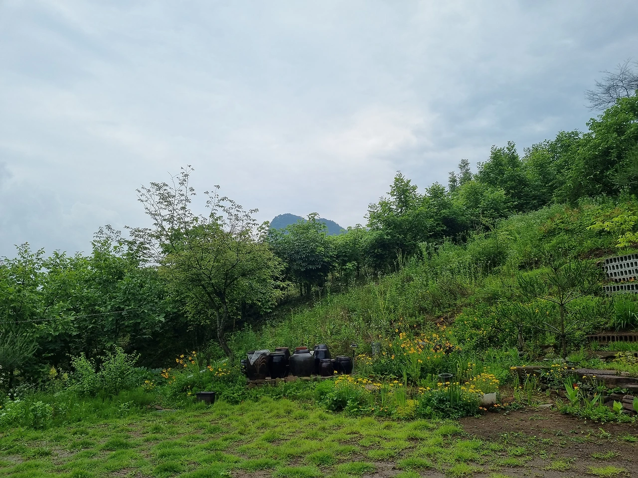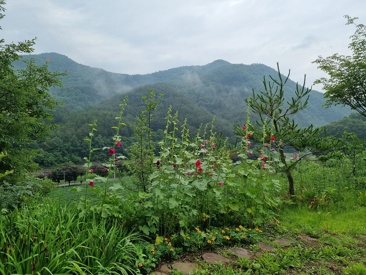 숙소에 도착해 체크인을 하고 짐을 풀었다. 멀리 산 중턱에 구름이 끼어서 운치있었다. 접시꽃과 산수국이 이쁘게 피어 있었다. 아까부터 내리던 비가 계속 내렸다. 추적추적 내리다가 그치다가를 반복해서 바베큐를 할 수 있을까 싶었다.