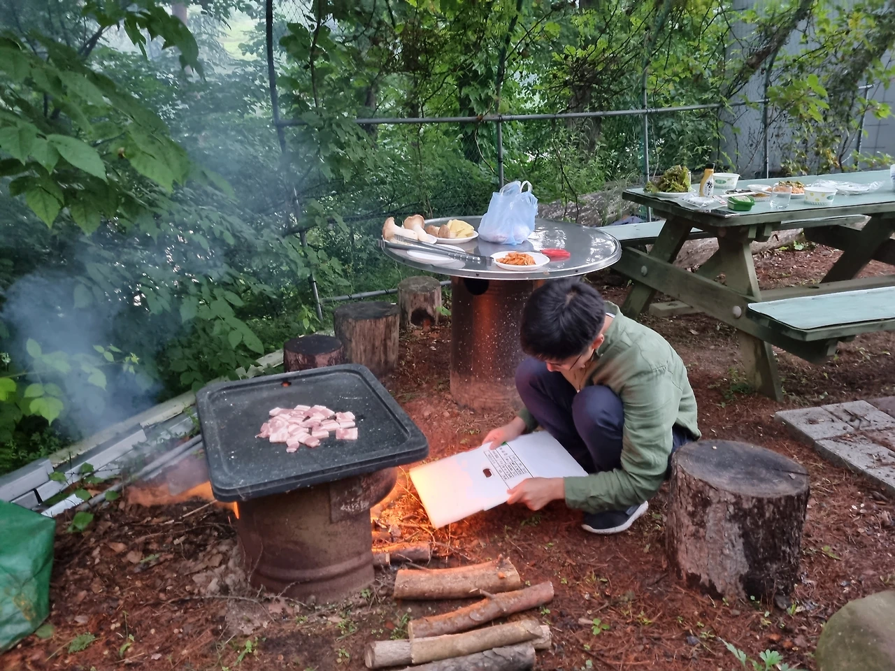 영양 죽파리 자작나무 숲에 들렀다가 미리 잡아둔 에어비앤비 숙소로 향했다. 자작나무 숲까지 왔다갔다 꽤 걸었던터라 우리 둘은 기진맥진한 상태였다. 산 속 깊숙한 곳에 숙소를 잡은 우리는 바베큐를 해먹기로 했다. 사실 좀 체력적으로 힘들었던터라 그냥 식당에서 먹을까도 생각했는데 주위에 식당이 없었다. 허허, 어쩌다 보니 강제 바베큐 행이었다. 산 속에 왔으니 그래 바베큐가 제맛이지!