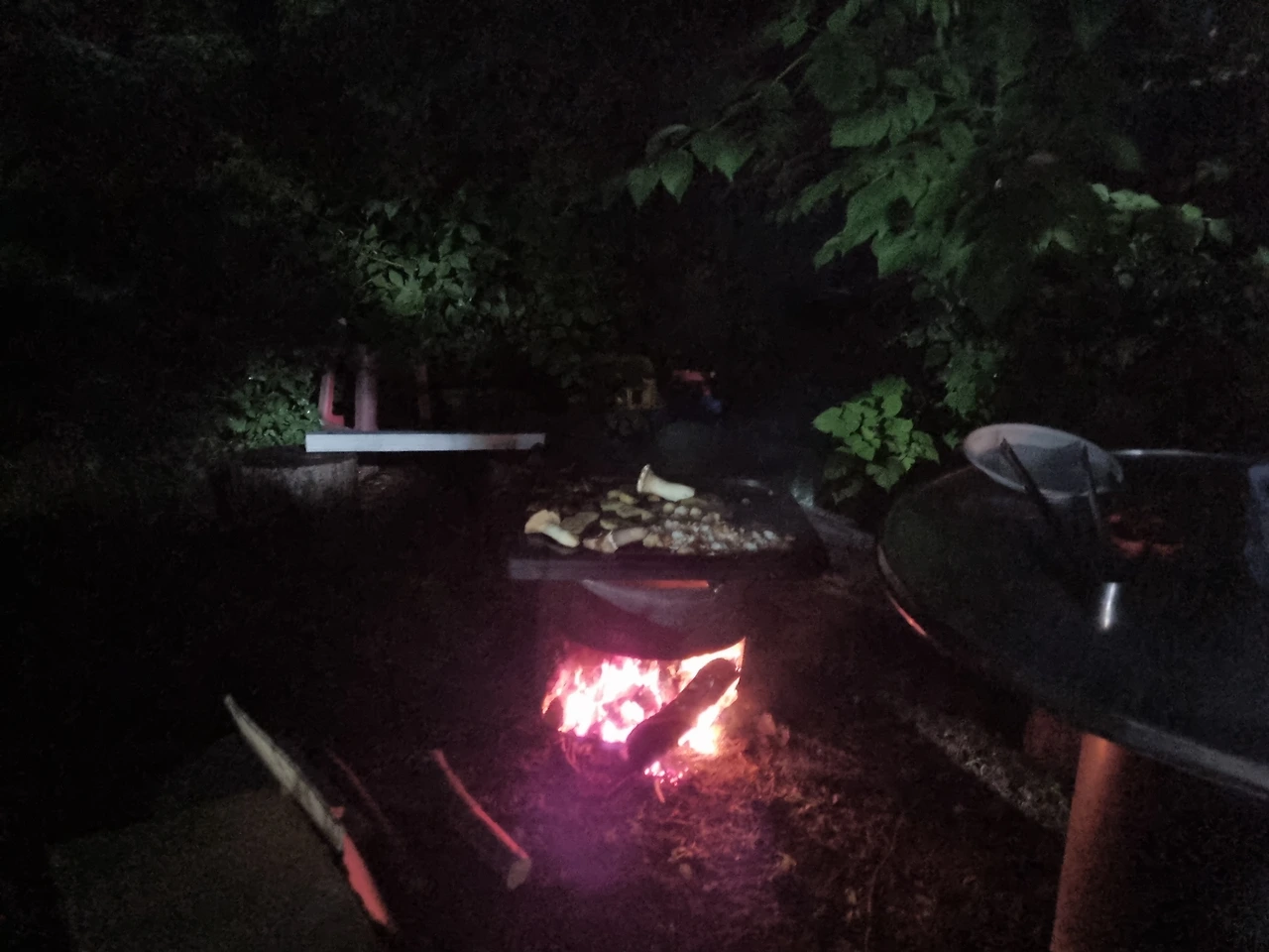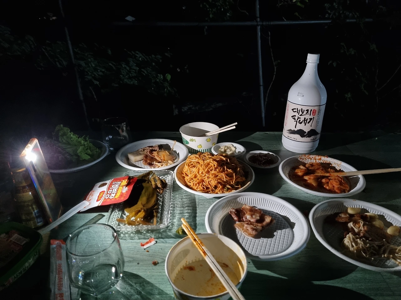 어둠이 내리고 불판 위는 뜨겁게 달궈졌다. 김치와 감자, 버섯도 삼겹살과 함께 불판 위에서 고기 기름을 머금고 지글지글 익고 있었다. 한여름 밤 바베큐, 역시 이런 곳에 와서는 이런게 재미인가 보다. 모기향 냄새가 솔솔 풍기며 왠지 모르게 절 속에 와있는 것 같은 기분도 났다.
