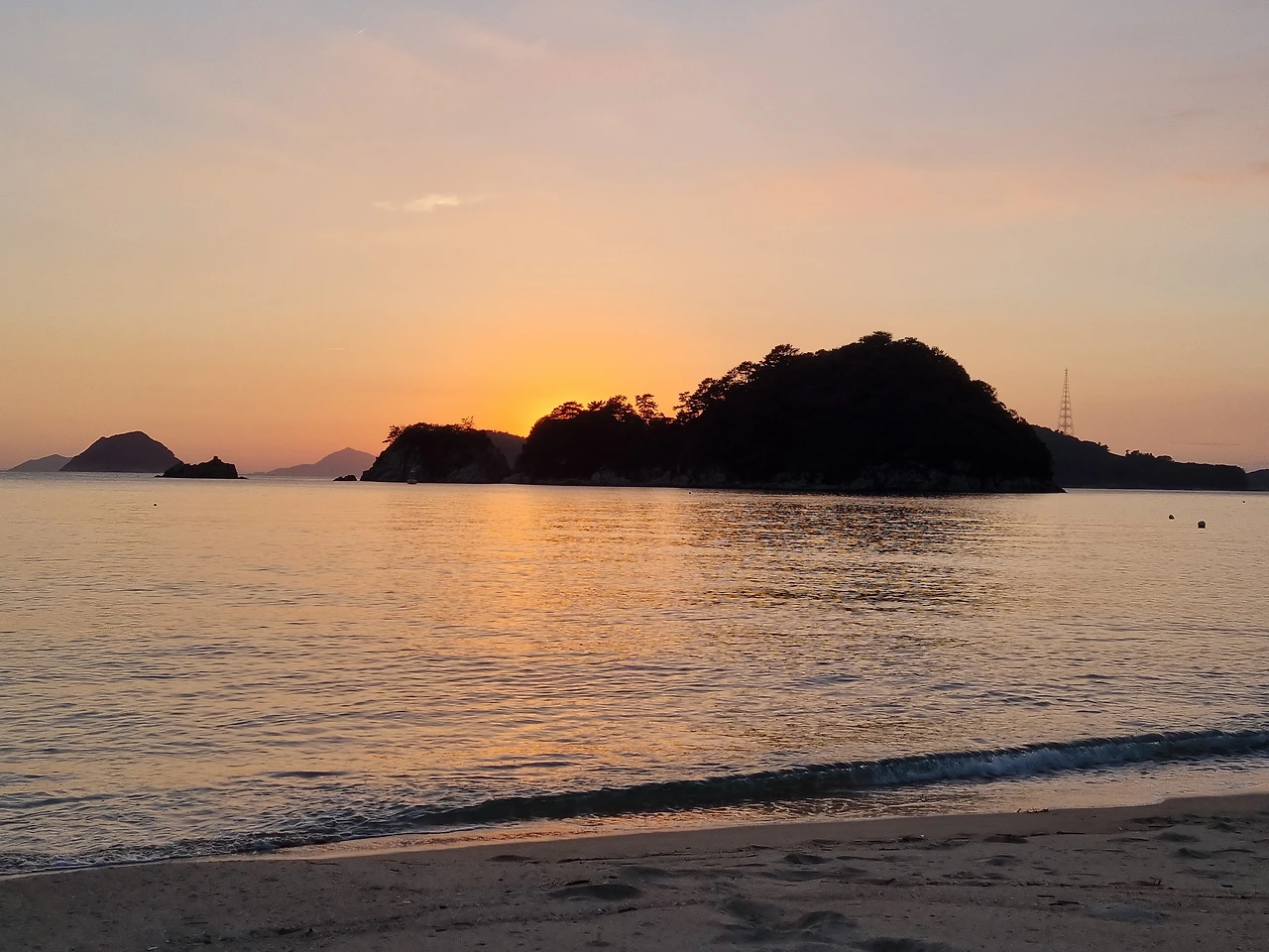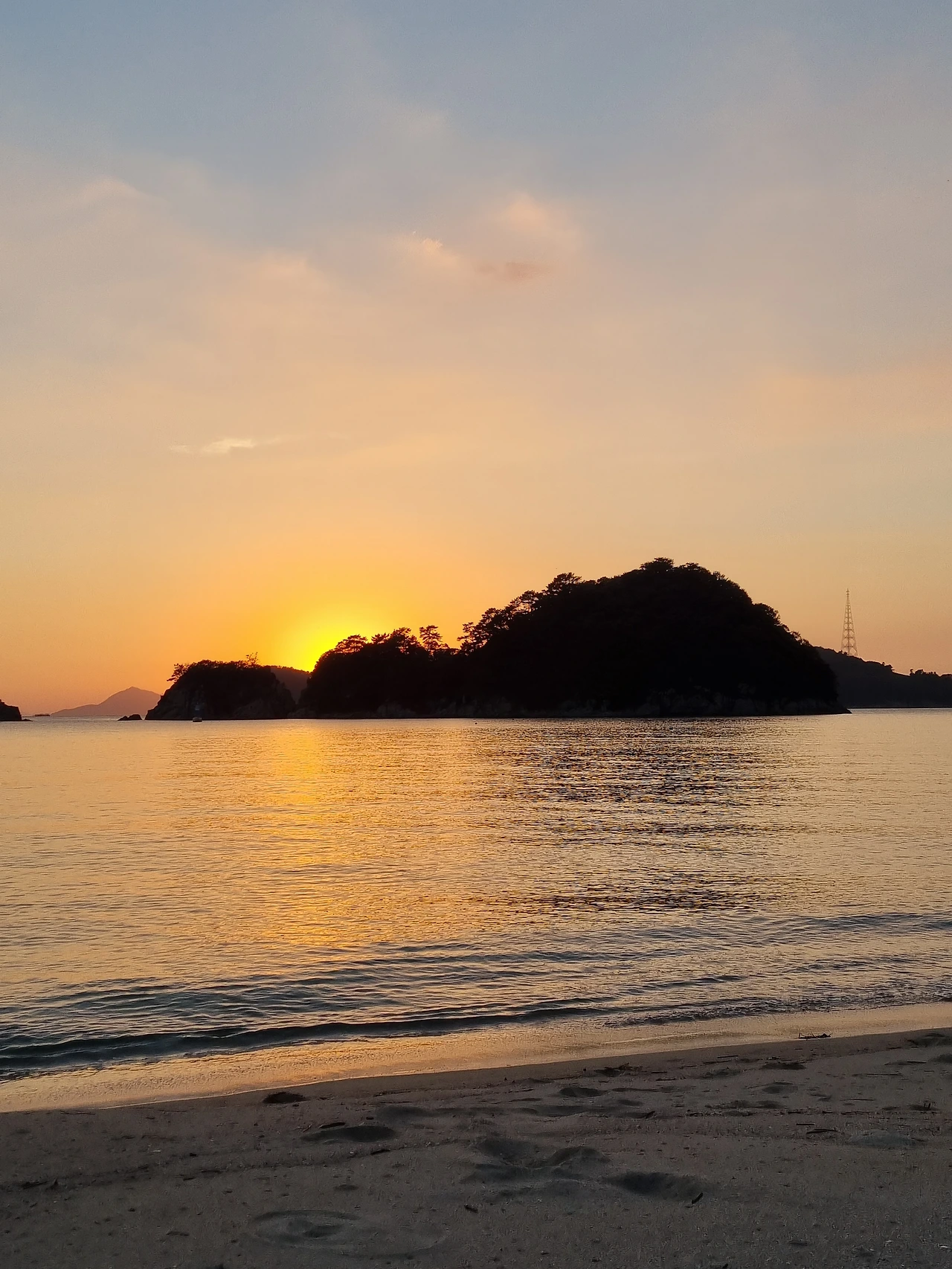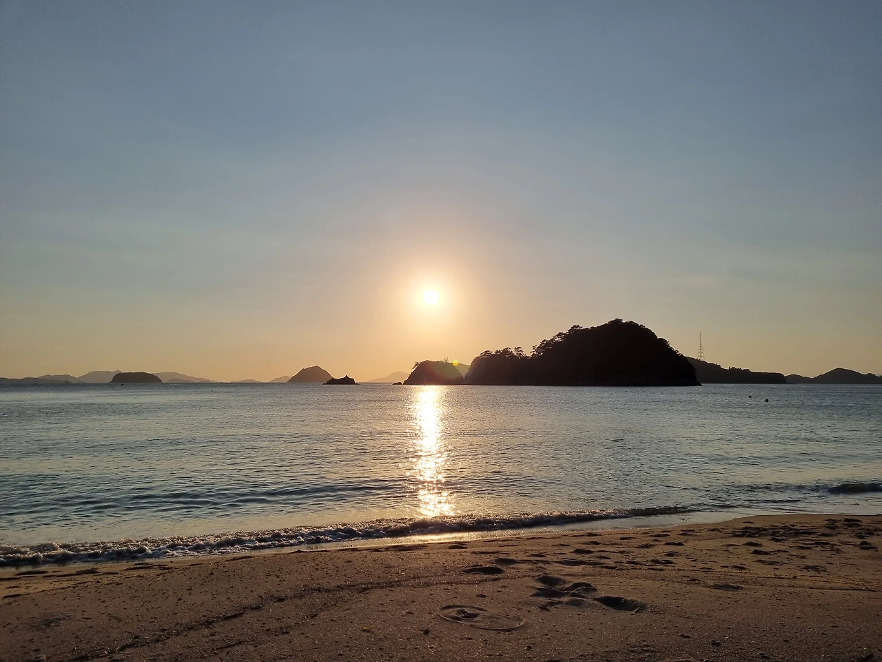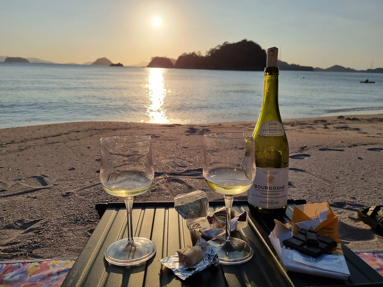 우리는 돗자리와 테이블, 와인, 안주 삼을 치즈와 초콜릿을 챙겨서 해변으로 나왔다. 눈앞에 보이는 작은 섬 위로 해가 떨어지고 있었다. 바다가 지는 햇살을 한껏 품고 아름답게 반짝반짝거렸다. 들썩들썩 신나는 기분으로 해변으로 걸어갔다.