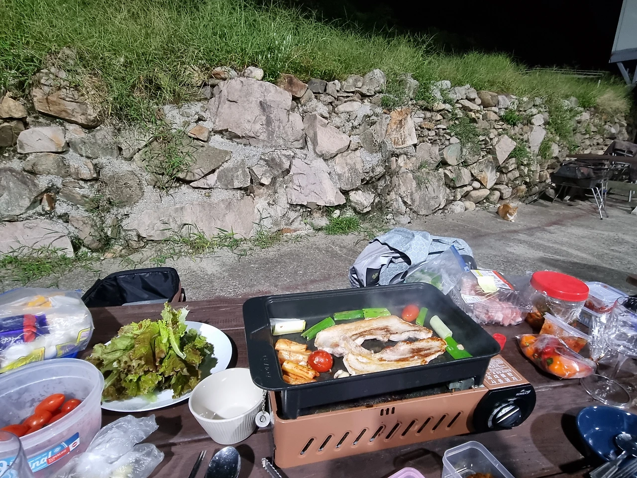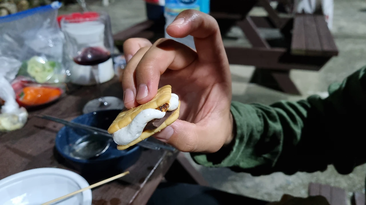 오늘의 저녁은 바베큐, 바베큐를 따로 신청하지 않고 챙겨간 구이바다에 고기를 구워 먹었다. 바리바리 싸들고 온 음식들이 빛을 발휘했다. 맛있게 삽겹살을 먹고 마시멜로우와 초콜릿, 에이스로 스모어도 해 먹었다.