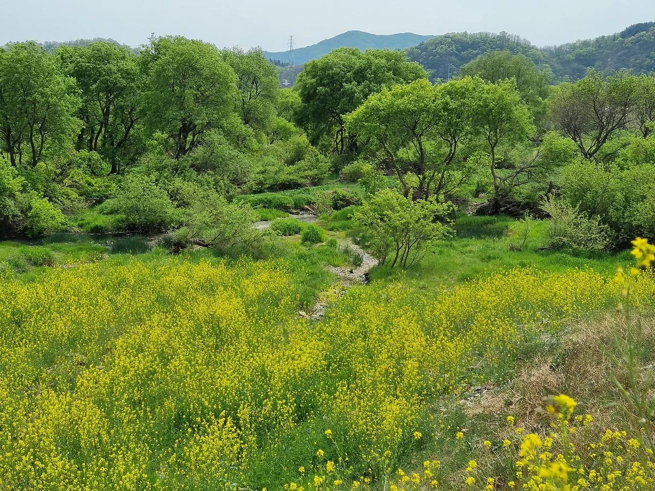 강가에 노랗게 피어난 유채꽃들을 볼 수 있다.