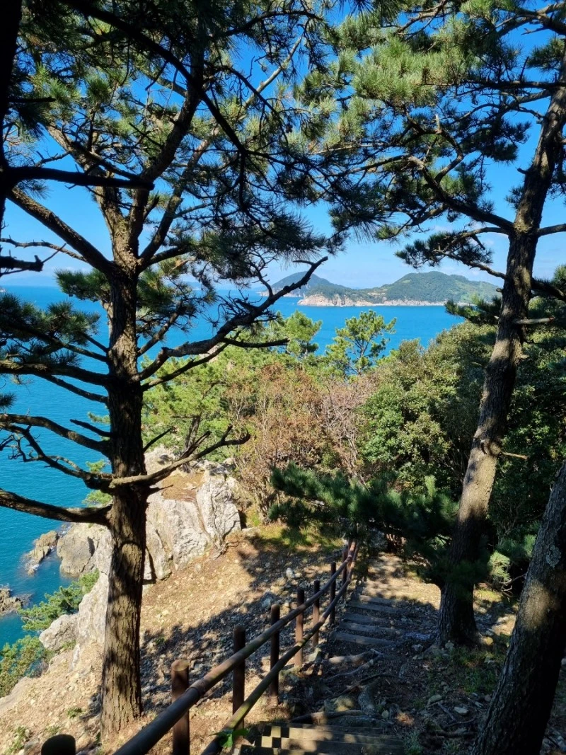 선유봉을 둘러서 내려가는 길, 올라올 때와는 다른 곳으로 내려가니 보이는 풍경이 달라서 좋았다. 선유봉을 오를 때는 산 속을 비집고 들어간 느낌이었는데 내려갈 때는 바다와 함께 걷는 느낌이었다. 섬 가장자리 가파른 절벽과 반짝거리는 바다를 보며 걸어 내려갔다.