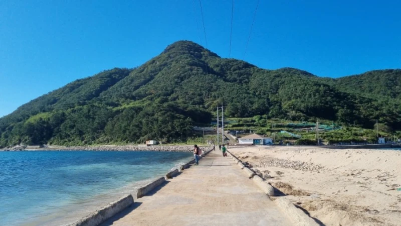 얼마나 걸었을까 드디어 멀리 우리가 건너온 길이 보이기 시작했다. 안도의 한숨이 터져 나왔다. 푸른 바다와 그 위에 놓인 길, 우리는 정말 한참을 걸어 내려온 것 같았다. 올라갈 때 보다 내려가는 길이 선유봉을 둘러 가서 그런지 훨씬 더 오래 걸렸다. 점점 힘들어갈 즈음에 나타난 외항 마을이 어찌나 반갑던지 갑자기 힘이 솟아 룰루랄라 걸어갔다.