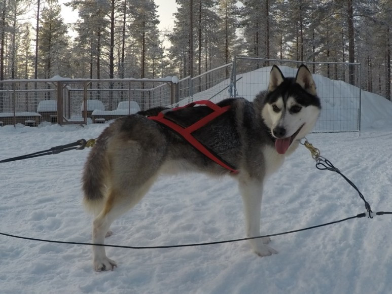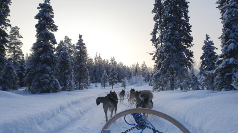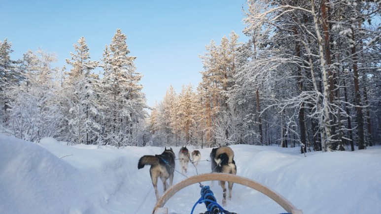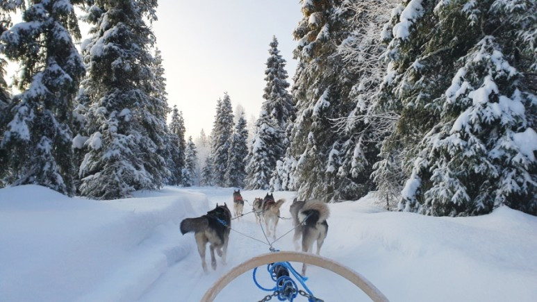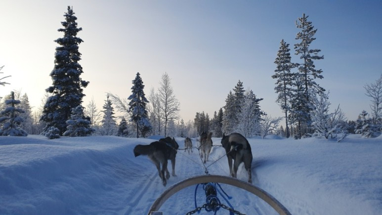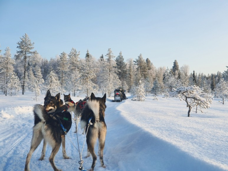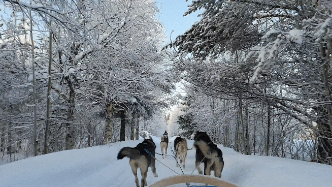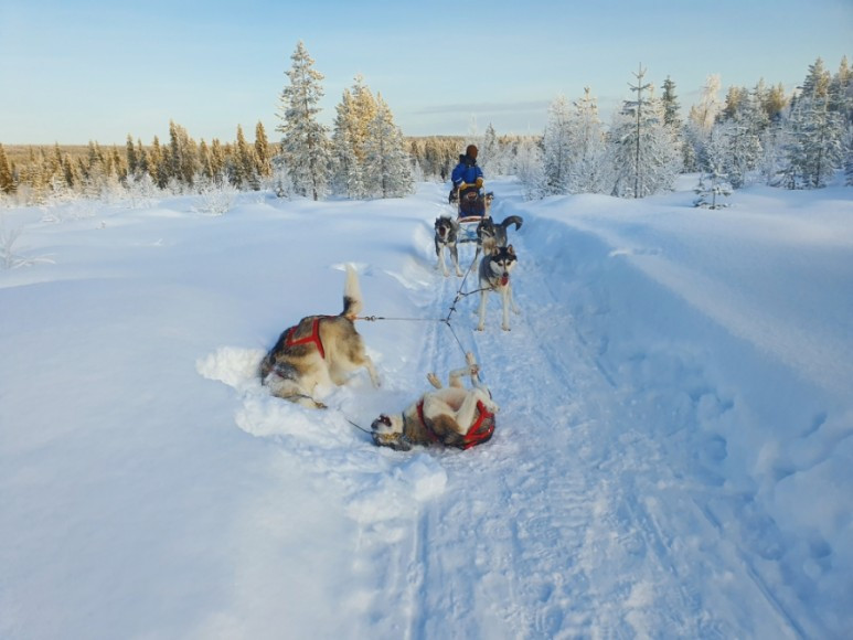긴장을 한 탓에 설명의 반은 알아듣고 반은 알아듣지 못했다. 왠지 사고가 날 것 같아 겁을 먹어서 난 썰매 위에 앉고 남편이 썰매를 조정하는 뒷편에 섰다. 썰매에는 허스키 다섯마리가 연결되어 있었다. 이 체험을 이끄는 선한 인상의 현지인이 스노모빌에 올라탄 뒤에 앞장서서 출발했다. 허스키들은 스노모빌을 타고 있는 아저씨를 따라 열심히 달렸다.