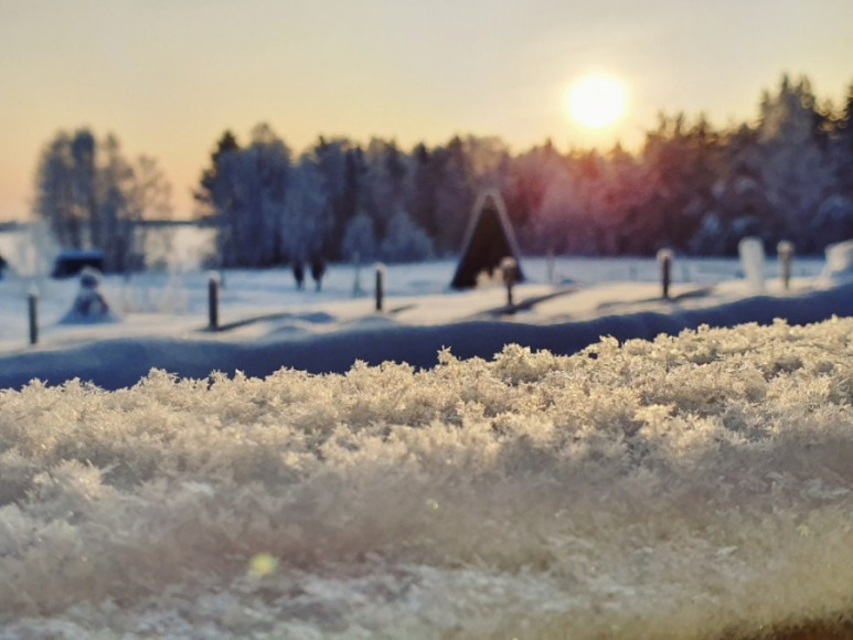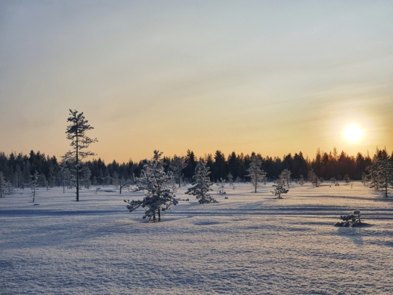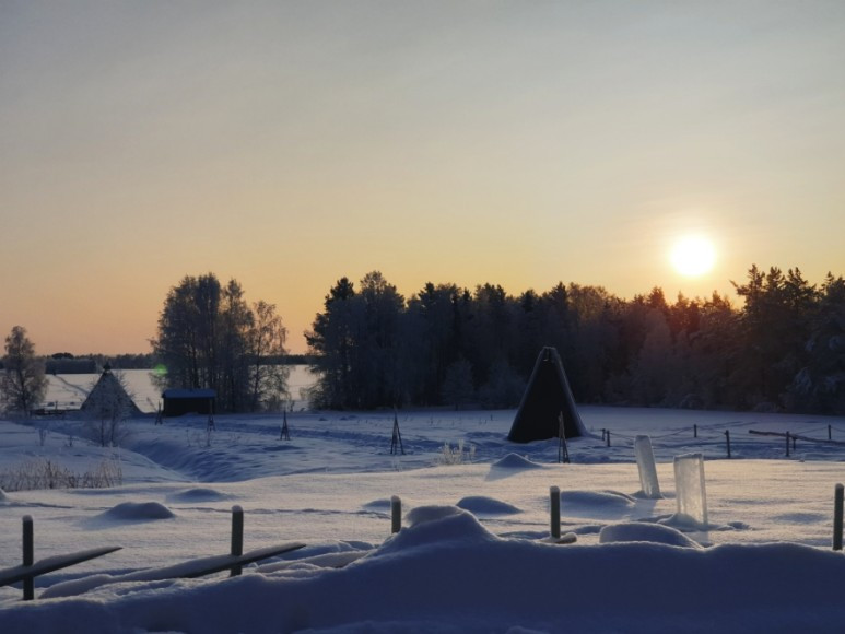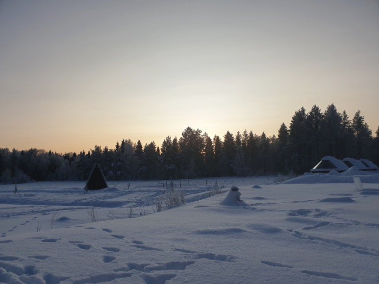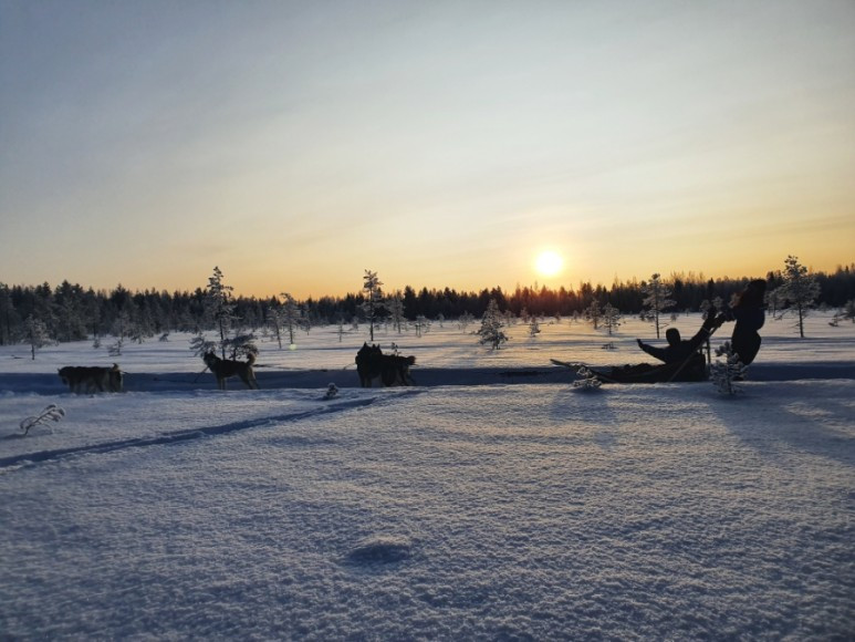 은은한 노을로 물들어가는 하얀 눈, 이곳에서 투어 가이드 분이 기념 사진을 여럿 찍어 주셨다. 우리는 한동안 저무는 해를 바라보았다. 소복히 쌓인 눈과 검은 나무들과 주홍빛 하늘, 체험 중 가장 아름다웠던 순간이었다.