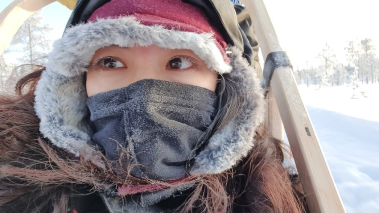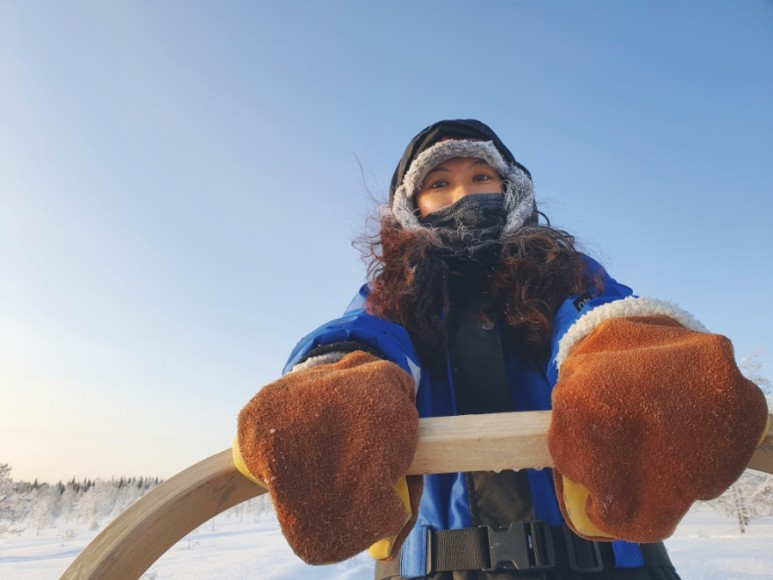 내가 내뿜는 입김이 천으로 얼굴을 두른 탓인지 위로 올라와 속눈썹이 하얗게 변했다. 신기했다. 코털에도 얼음 결정이 그렁그렁 맺혔다. 설원 위를 달려가는 길에 보이는 환상적인 풍경들, 황홀했다. 이 풍경들을 꼭 다시 보고 싶을 것 같았다. 그리고 허스키 썰매도. 어느 겨울날 다시 눈의 나라를 찾아와야겠다.