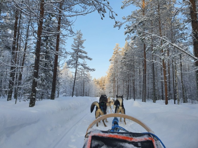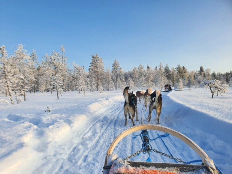 우리는 설원을 달리고 있었다. 썰매의 속도는 생각했던 것보다 훨씬 더 빨랐다. 썰매 위에 앉아 눈길 위를 달리는데 풍경이 너무 아름다웠다. 그 누구도 밟지 않은 새하얀 눈이 소복히 쌓여 있었다. 그리고 하늘로 솟은 나무들의 가지마다 하얀 눈꽃이 피어 있었다. 파란 하늘은 구름 한 점 없이 맑은 하늘이었고 우린 그 사이로 난 눈길 위를 씽씽 달렸다.