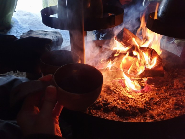 움막 안에서는 모닥불이 피어오르고 있었다. 우리는 불을 쬐며 추위를 녹였다. 나무 타는 냄새가 좋았다. 가이드 아저씨는 커다란 텀블러를 꺼내 작은 나무 컵에 차를 따라 주었다. '쿡사'라고 부르는 핀란드의 전통 나무 컵이었다. 따뜻한 베리차를 마시니 온몸이 녹아내리는 듯 했다. 모닥불 앞에 모여 앉아 차를 마시고 가이드 아저씨가 준 생강 쿠키를 냠냠 먹었다.