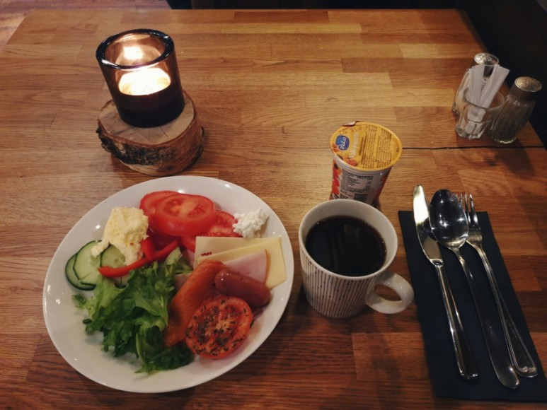 햄과 치즈, 토마토, 오이, 커피 그리고 빵. 특별할 것도 없지만 보장된 맛의 음식들이었다. 난 아침에 밥이 아닌 이렇게 빵과 야채들로 간단하게 먹는 걸 좋아한다. 그런데 이곳 로바니에미에서의 식사는 헬싱키에서 머물렀던 라플란드 호텔에서 먹었던 아침이랑 비교가 되긴 했다. 라플란드 호텔 조식은 먹거리들이 종류가 다양해서 풍부했고 직접 만든 스무디가 참 꿀맛이었다. 뭐, 아침을 주는 것이 어디냐! 우리는 감사히 배를 채웠다.