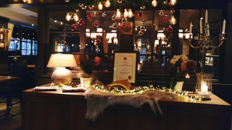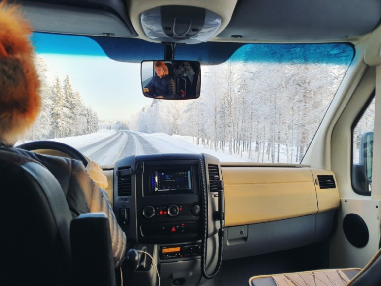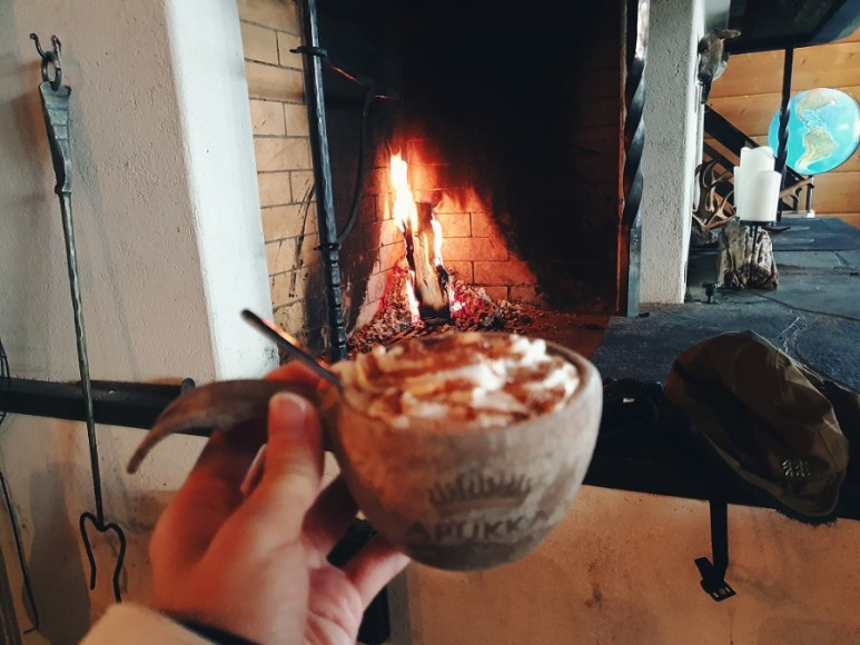 막간을 이용해서 레스토랑 바에 가서 음료들을 주문했다. 남편은 핀란드 전통 술과 베리즙을 섞은 음료를 마시고 난 술이 들어간 핫초코를 시켰다. 이 추운날 왜 도수가 높은 술을 마시는지 조금은 알 것도 같았다. 불을 쬐고 음료를 마시며 몸을 녹이며 쉬다가 픽업 차량을 타러 나갔다. 밖은 이미 어둑해지고 있었다.