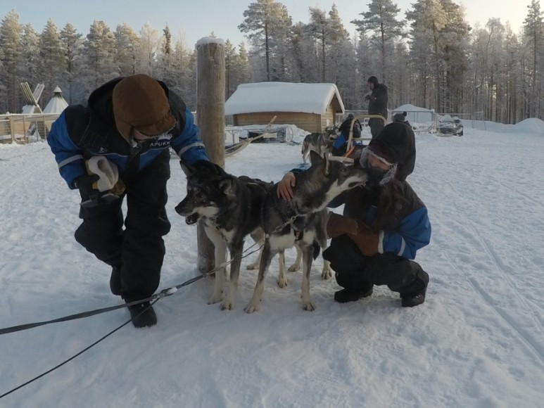 우리는 썰매를 끌어준 허스키들과 인사하고 같이 사진도 찍었다. 나는 겁먹어서 허스키들에게 가까이 다가가지 못했는데 남편은 허스키 옆에 앉아 쓰다듬기도 하고 목을 감싸기도 했다. 핸드폰이 방전되어서 고프로로 열심히 찍었는데 결국 고프로도 방전 되었다. 배터리가 나간게 아니라 추워서 꺼져버린 것이었다.