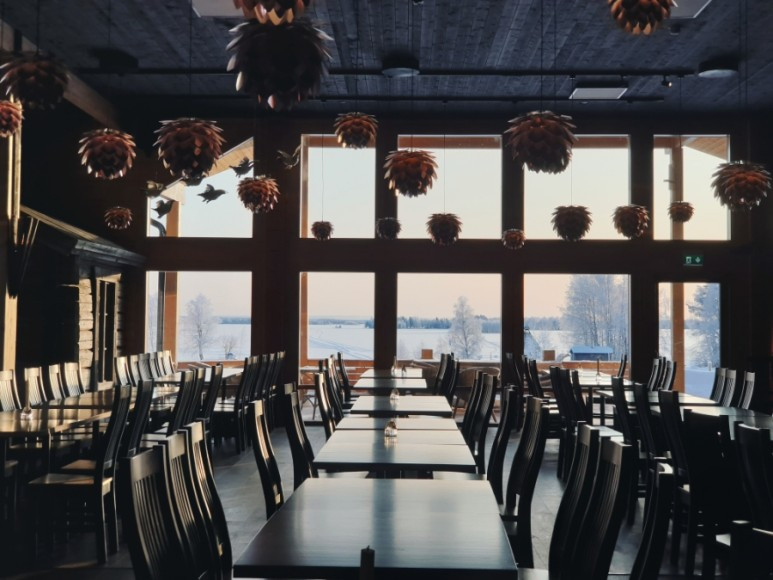 로바니에미에서 맞이하는 둘쨋날, 이날은 허스키 썰매 타기 체험을 예약해 둔 날이었다. 이른 아침에 눈을 뜬 우리는 일어나 조식을 챙겨 먹으려고 호텔 1층 레스토랑으로 내려왔다. 어젯밤에도 이 레스토랑에서 먹었는데 어쩌다 보니 아침도 이곳에서 먹게 되었다. 우리는 어제 저녁을 먹었던 바로 똑같은 자리에서 아침을 먹었다. 조식은 뷔페식이었는데 유럽을 다니며 항상 먹던 그런 메뉴의 아침이었다.