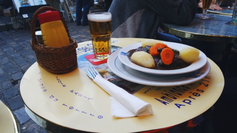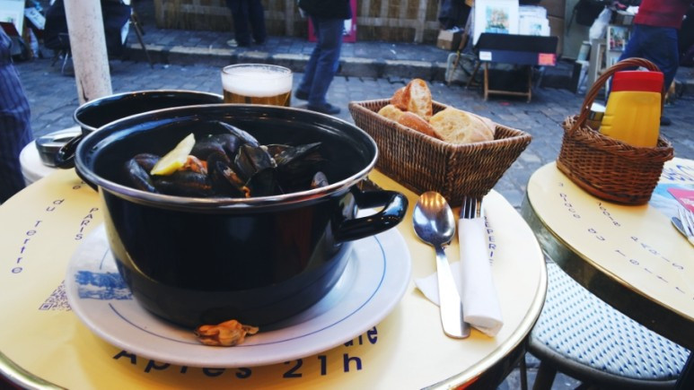 배가 고파진 우리는화가들이 즐비한 돌길 위를 걷다가 어느 식당 안으로 들어갔다. 거리가 훤히 보이는 야외 테이블에 앉아서 뵈프 부르기뇽과 홍합 요리를 주문했다. 그리고 시원한 블랑 생맥주도 한잔씩 주문했다.