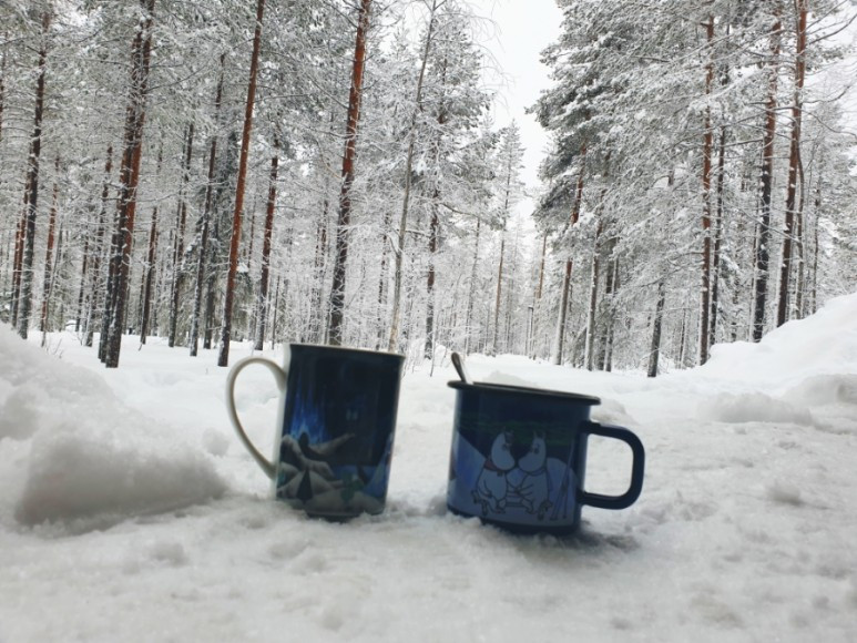 맛나게 라면을 먹고 나서 후식으로 핫초코를 마시기로 했다. 눈으로 가득한 추운 겨울 세상 속 김이 폴폴나는 뜨끈한 핫초코를 마신다고 상상하니 어찌나 기쁘던지. 로바니에미를 여행하며 산 오로라가 그려진 컵과 무민 법랑컵에다가 핫초코를 쉭쉭 타서 밖으로 나왔다. 설경을 바라보며 눈 밭위에서 마시는 핫초코, 잊을 수 없던 순간이다.