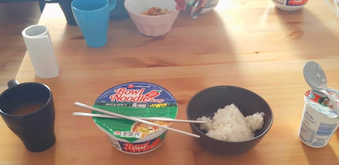 한국에서는 왜 아침형인간이 될 수 없었을까 생각하며 새로운 일상에 재미를 붙였다. 숙소에서 제공되는 조식은 컵라면과 밥이었다. 밥은 딱딱하게 굳어있어 오래된 것 같았다. 평소 같았으면 먹지 않았겠지만 타국에서의 밥은 어찌되었건 좋았다. 라면 국물에 밥을 말아 먹으니 환상적인 맛이었다. 라면 발명한 사람은 정말 큰 상을 줘야해, 그런 생각을 하며 우걱우걱 아침을 먹었다. 어제 사둔 요플레랑 쥬스를 후식삼아 먹는 것으로 풍족한 아침식사를 마쳤다.