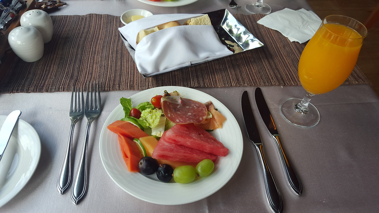 여러 과일들과 샐러드 야채, 치즈와 햄 등이 샐러드 바쪽에 있어서 마음껏 덜어 먹을 수 있었다.