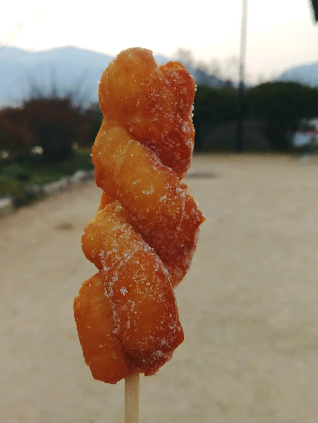 영남루에서 내려와 밀양 시장에서 사온 꽈배기를 또 꺼내어 먹었다.