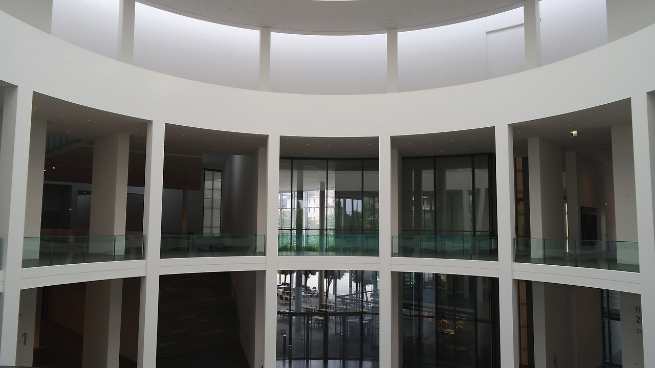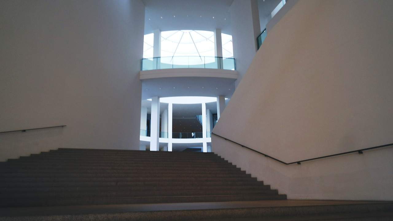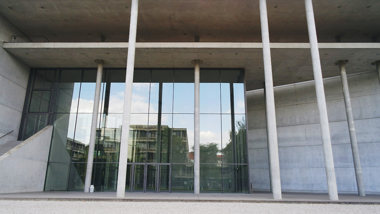 피나코텍 모던. 콘크리트 거대한 회색 건물이 인상적이었다. 높다란 원형 기둥들이 곳곳에 세워져 있었다. 건물 외관을 둘러싼 통유리창에는 푸른 하늘이 비쳤다. 문득 예전에 들렀었던 강원도 원주에 있는 '뮤지엄 산'이라는 곳이 떠올랐다. 노출 콘크리트로 유명한 안도 타다오가 설계한 뮤지엄으로 자연속에 조화롭게 자리잡은 아름다운 건축물이 인상적인 곳이었다. 콘크리트 벽체에 동그란 구멍이 송송 박혀있어서 뮤지엄 산이 떠올랐던 것일까?