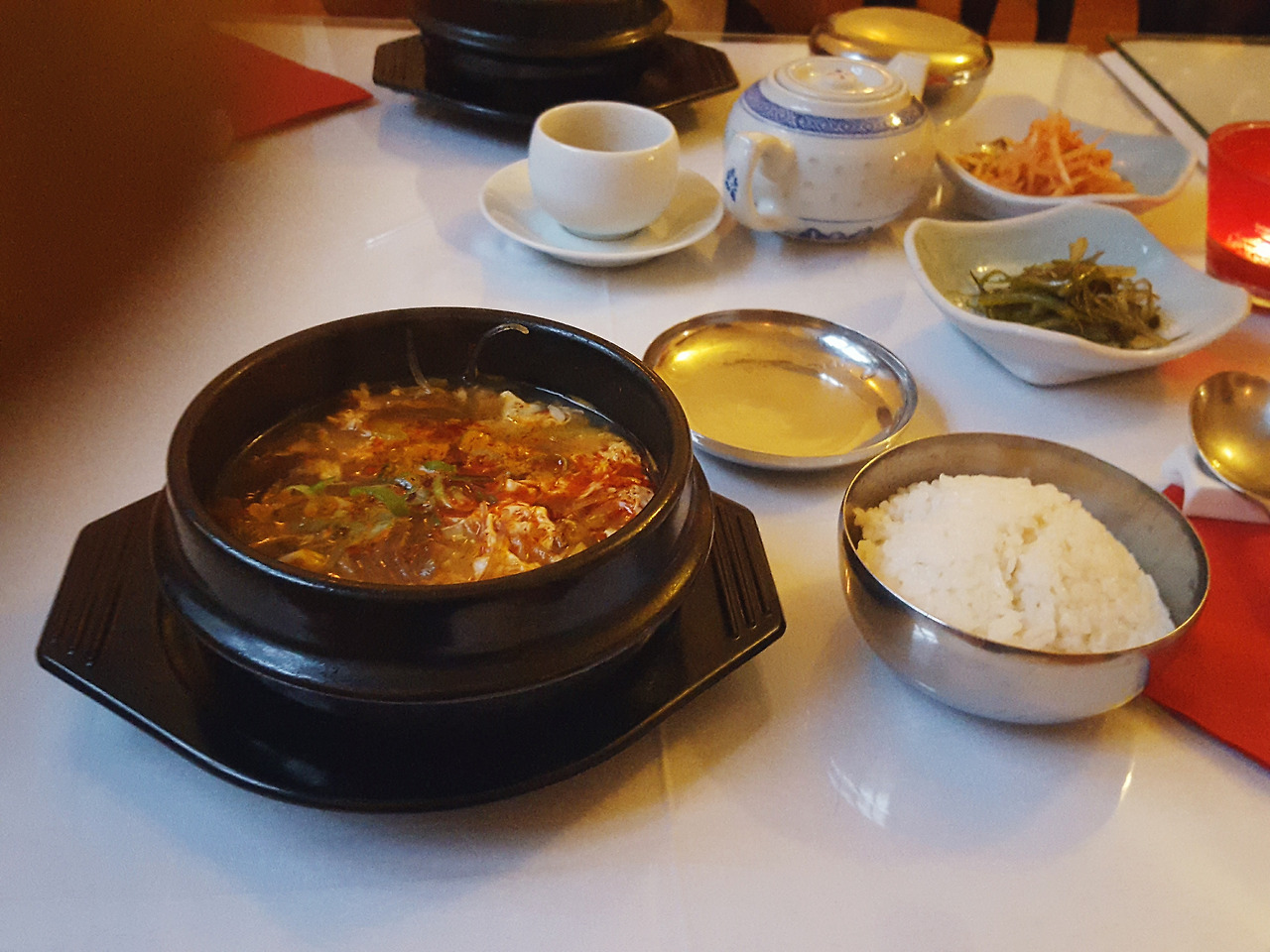 나는 육개장을 시켰다. 육개장 하나가 13.9유로라는 사실은 다소 충격적이었지만 그래도 괜찮았다. 이 유럽땅에서 육개장을 먹을 수 있다는 것만으로도 다행이었다. 육개장은 정말 너무 맛있어서 감동의 맛이라는 말은 이런 때 쓰는 거구나 싶었다. 한국에서 먹어본 육개장을 모조리 다 합해도 이곳 육개장 맛은 못따라갈 거 같다. 이건 마치 선조가 전란이 끝난 후 은어를 '도로 묵이라 하여라' 한것과 비슷한 상황 같지만 말이다. 몽글한 계란과 고사리 그리고 소고기가 알차게 들어가 있었다. 나는 밥알 한톨 남기지 않고 싹싹 긁어 먹었다.