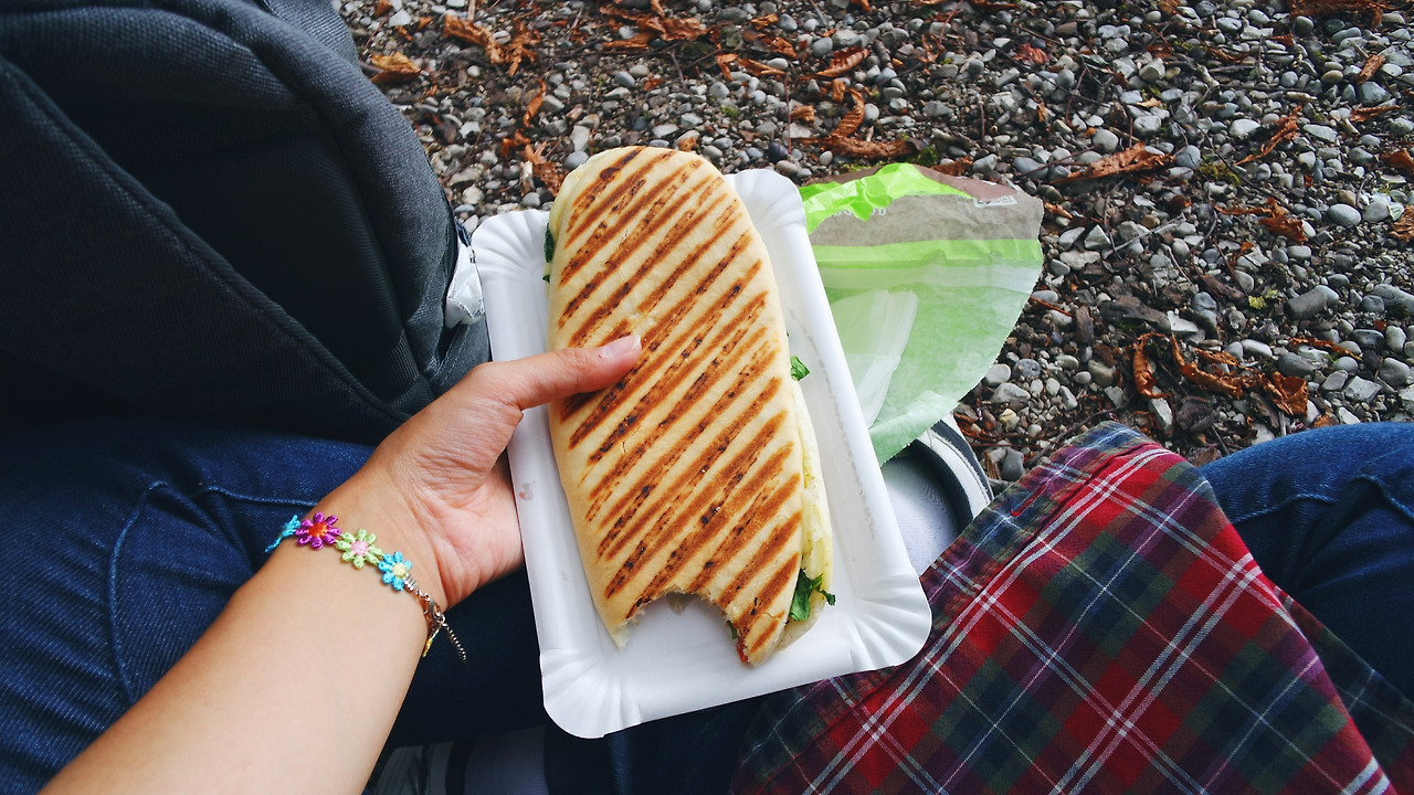 님펜부르크 정원을 둘러보며 중간에 초콜릿으로만 허기를 채웠던터라 배가 많이 고팠다. 뮌헨 중앙역에서 물과 파니니를 사서 가방에 넣어 챙겨왔다. 물은 볼빅(Volvic)이라고 적힌 프랑스산 물이 제일 괜찮아서 유럽여행 중 계속 이 물만 사먹었다. 물은 무맛이지만 이렇게 깔끔한 '무맛'이 나는 물이 의외로 별로 없었다. 걸핏하면 물에 탄산이 함유되어 있거나, 탄산이 없는 물이지만 쓴맛이 나는 경우도 있었다. 피나코텍 근처 돌바닥에 앉아 물과 파니니를 꺼내어 먹었다. 유럽여행 중 대부분 내 식사는 길바닥 혹은 걷는 와중에 해결했고 주메뉴는 샌드위치였다.