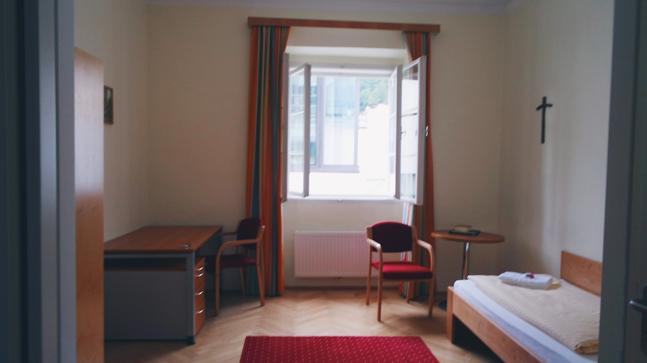 엘리베이터에서 내리니 초록색 카펫이 깔린 복도가 나타났다. 창가에는 화사한 꽃들이 피어나 있었고 하얀 벽면에는 종교화들이 걸려 있었다. 리셉션에서 받아든 묵직한 열쇠로 방문을 열었다. 혼자 쓰기에는 과분한 넓오 쾌적한 싱글룸이 나타났다.