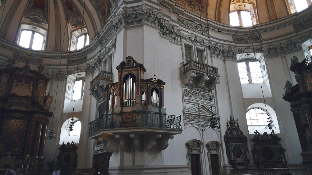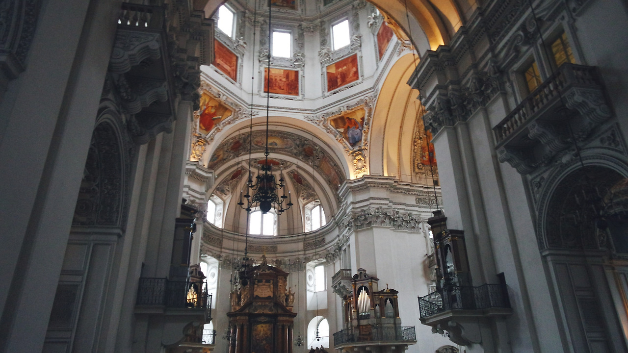 내가 들어갔던 곳은 '잘츠부르크 대성당'이다. 성당 안으로 들어서면 웅장한 규모의 홀이 나타나고, 높다란 돔구조의 천장 위로 아름다운 조각들과 벽화들이 보였다. 그리고 천장을 바라보던 고개를 조금 아래로 내려 보면 2층가에 자리잡고 있는 파이프 오르간을 보게 된다. 이 성당에는 모차르트가 연주했던 유럽 최대 규모의 파이프 오르간이 있다. 운이 좋다면 오르간 연주를 들을 수도 있다고 들었다.