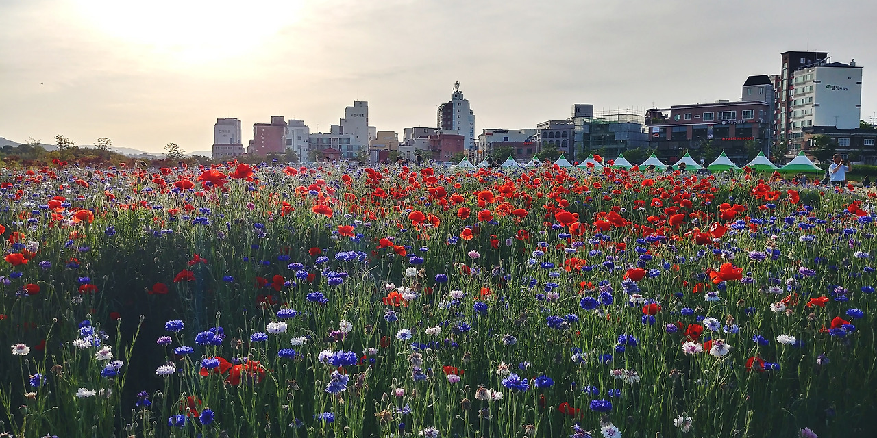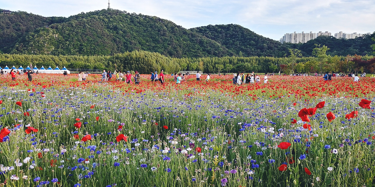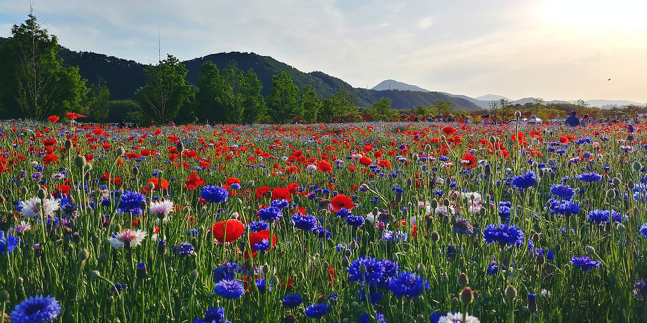 파란 수레국화와 붉은 양귀비가 가득한 태화강 공원