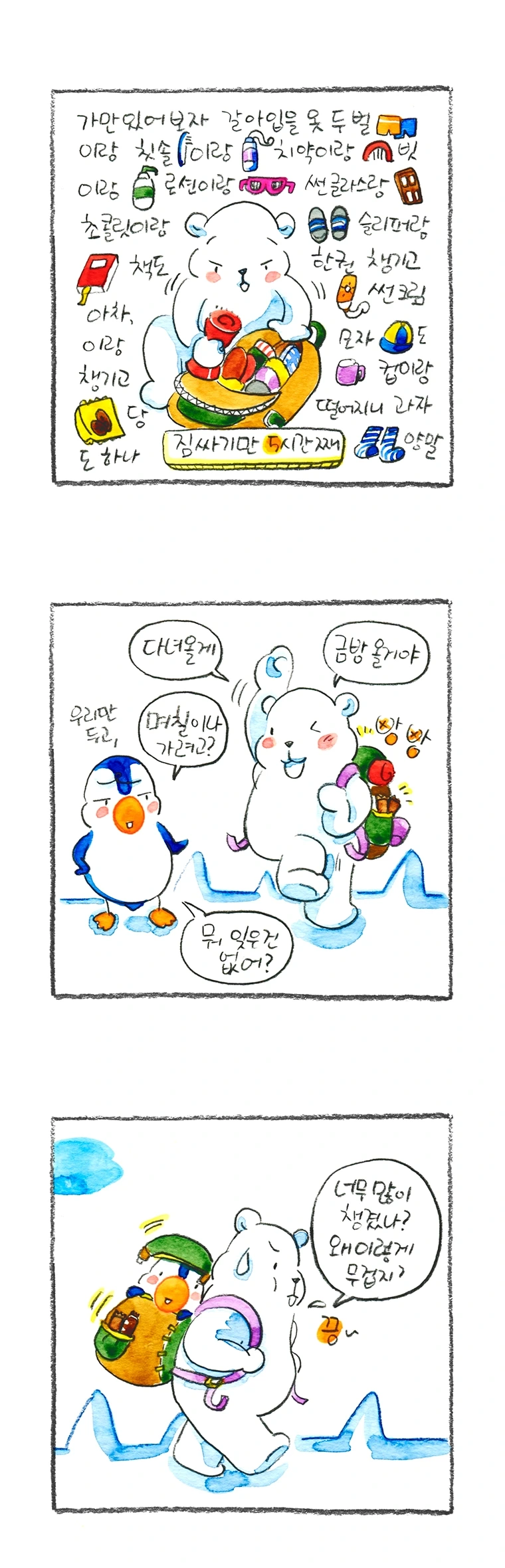 그런데 이상하다. 분명 즐거웠던 것 같은데 예쁘게 반짝거리던 잡화점 물건들 그중 마음이 닿은 것들을 달아보며 “어때 어울려?” 물어볼 사람이 없다는 것. 단지 그것만으로 조금 쓸쓸한 것 같기도...... 했지만 착각이다! 그러기엔 3박 4일이 너무 짧다.